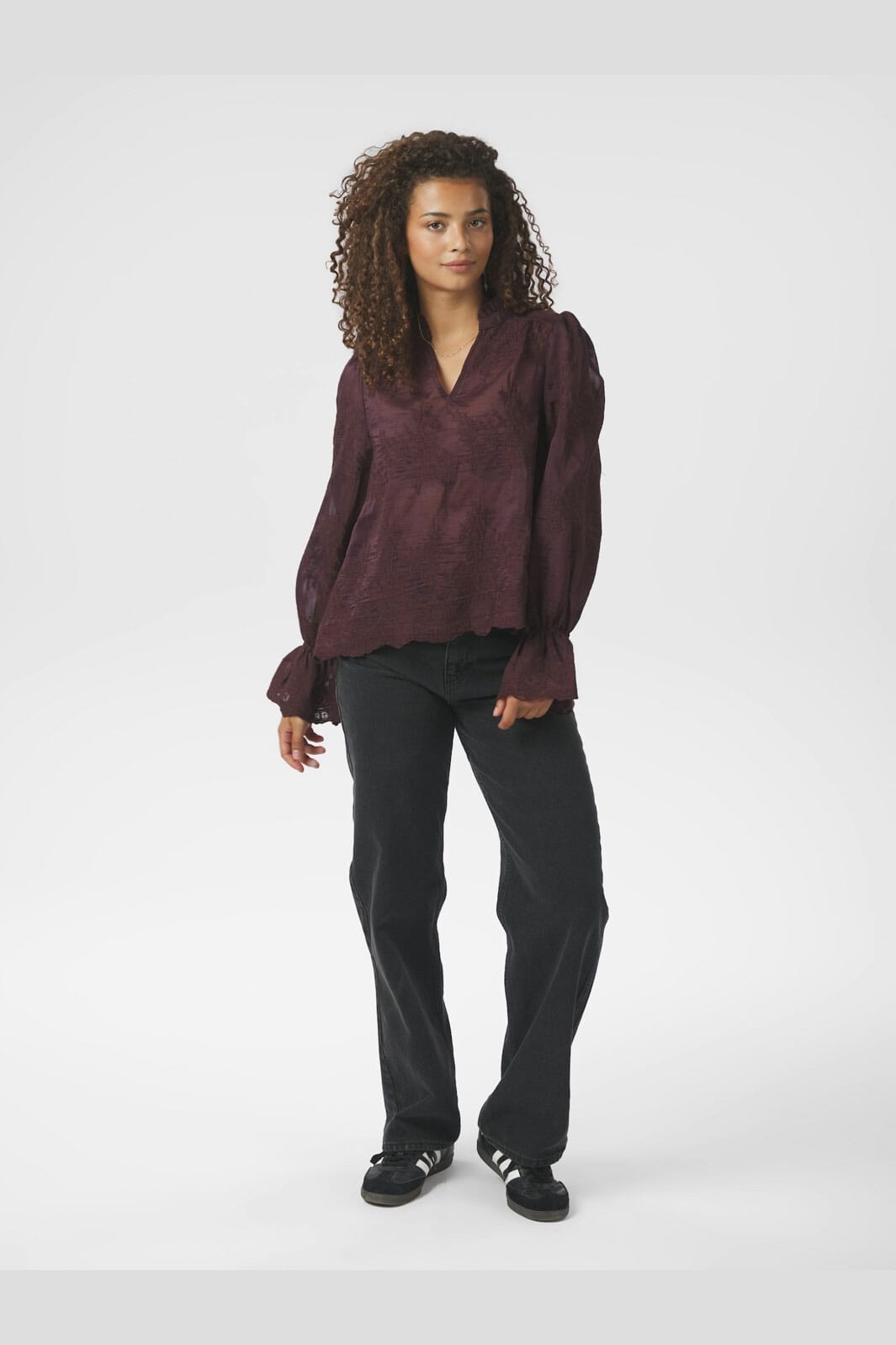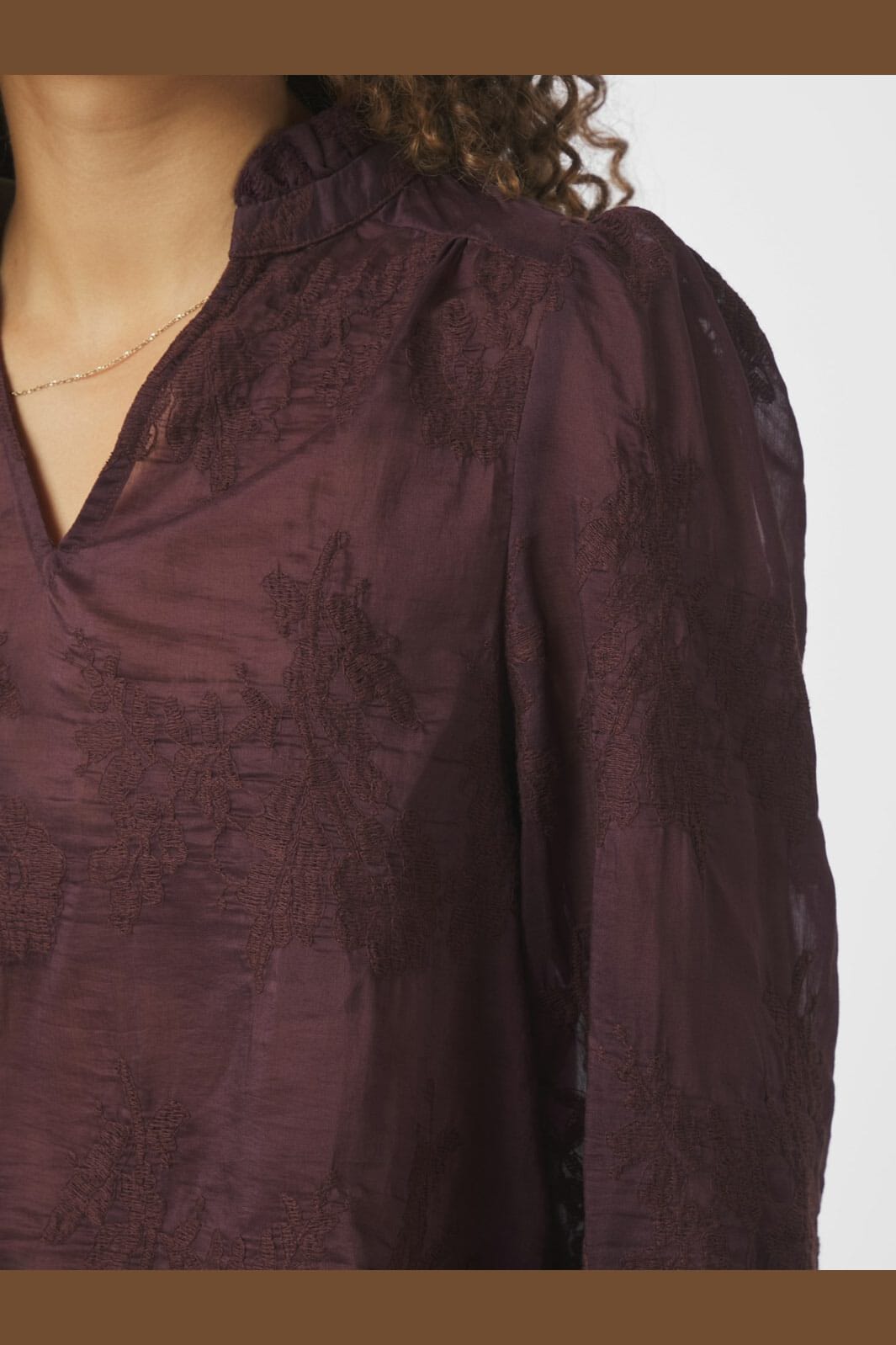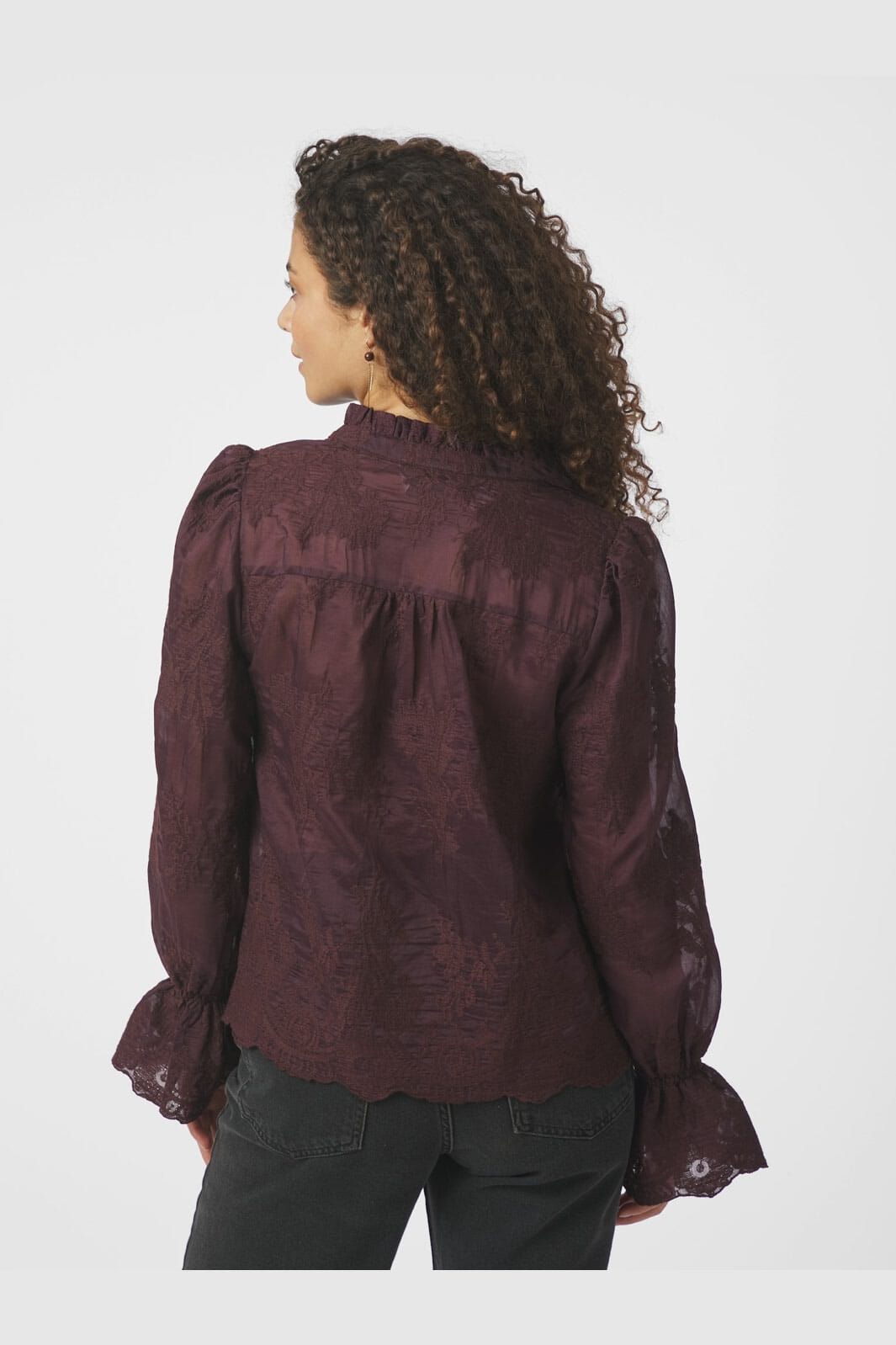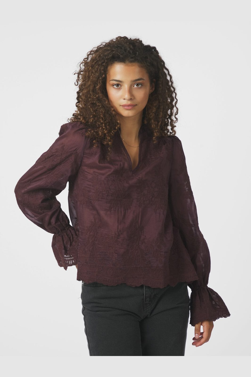 Bestickte Bluse von Neo Noir in einem tiefen Burgunderrot. Die Bluse hat ein Blumenmuster aus Stickerei über den gesamten Stoff, einen V-Ausschnitt und lange Ärmel mit gerafften Manschetten.