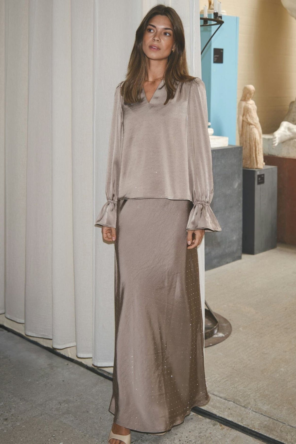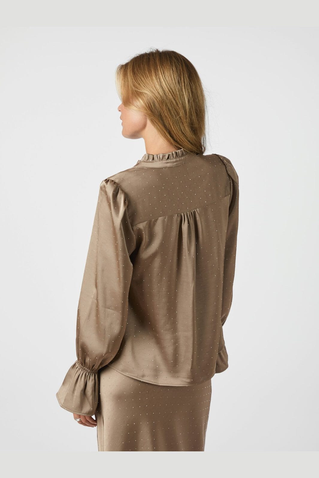 Braune Satinbluse von Neo Noir mit gepunktetem Muster und Pailletten. Die Bluse hat einen V-Ausschnitt mit gerafften Details und langen Ärmeln mit Rüschen an den Manschetten.