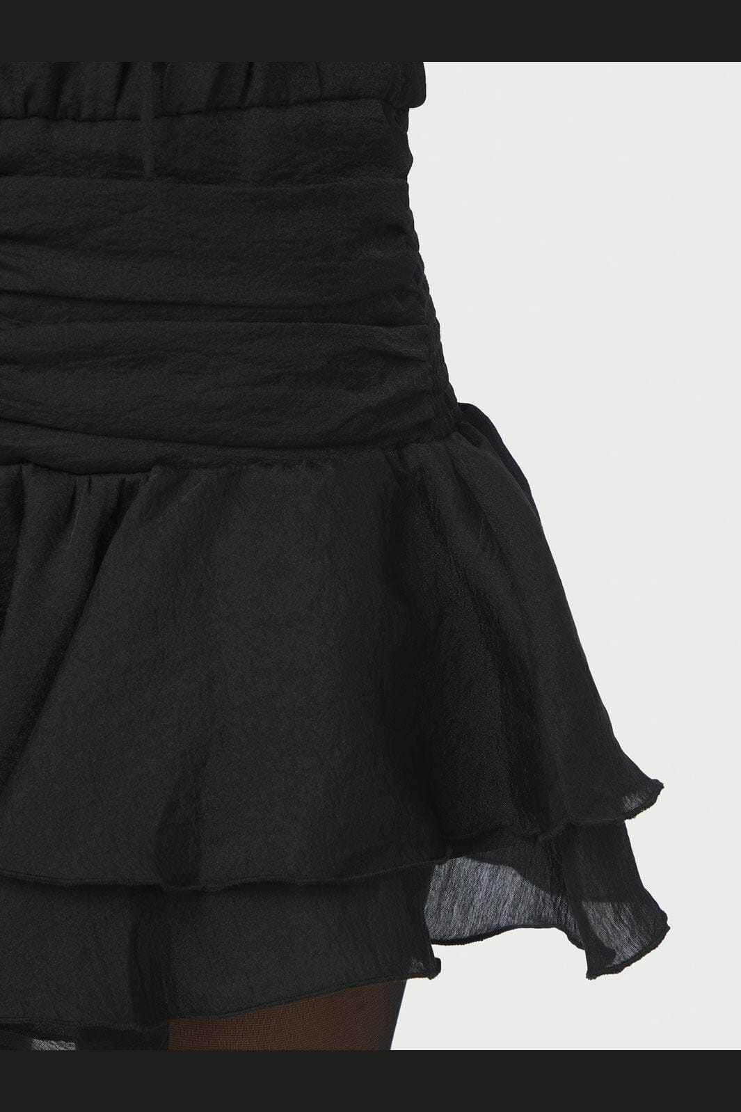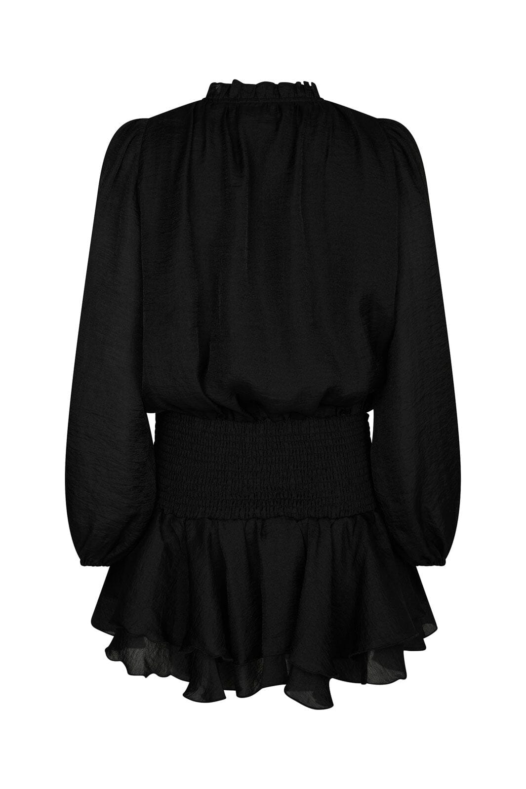 Schwarzes Chiffonkleid von Neo Noir mit V-Ausschnitt und Puffärmeln. Das Kleid hat zwei Lagen Rüschen und eine geraffte Taille mit Rüschensaum auf der Rückseite.