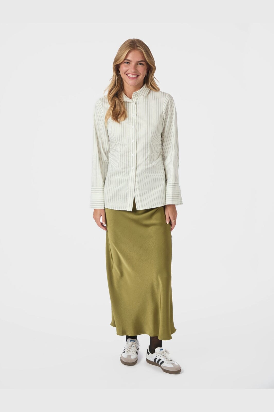 Gestreiftes Hemd von Neo Noir in gedämpftem Grün. Das Hemd hat vertikale Streifen in Grün und Creme auf weißem Grund.