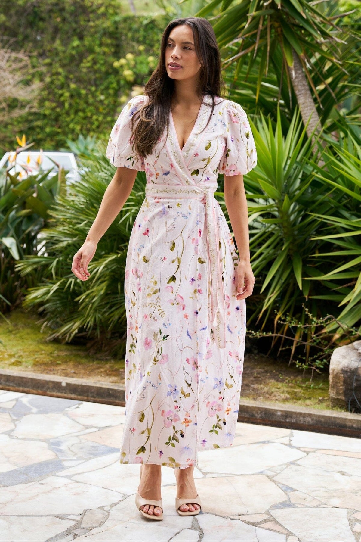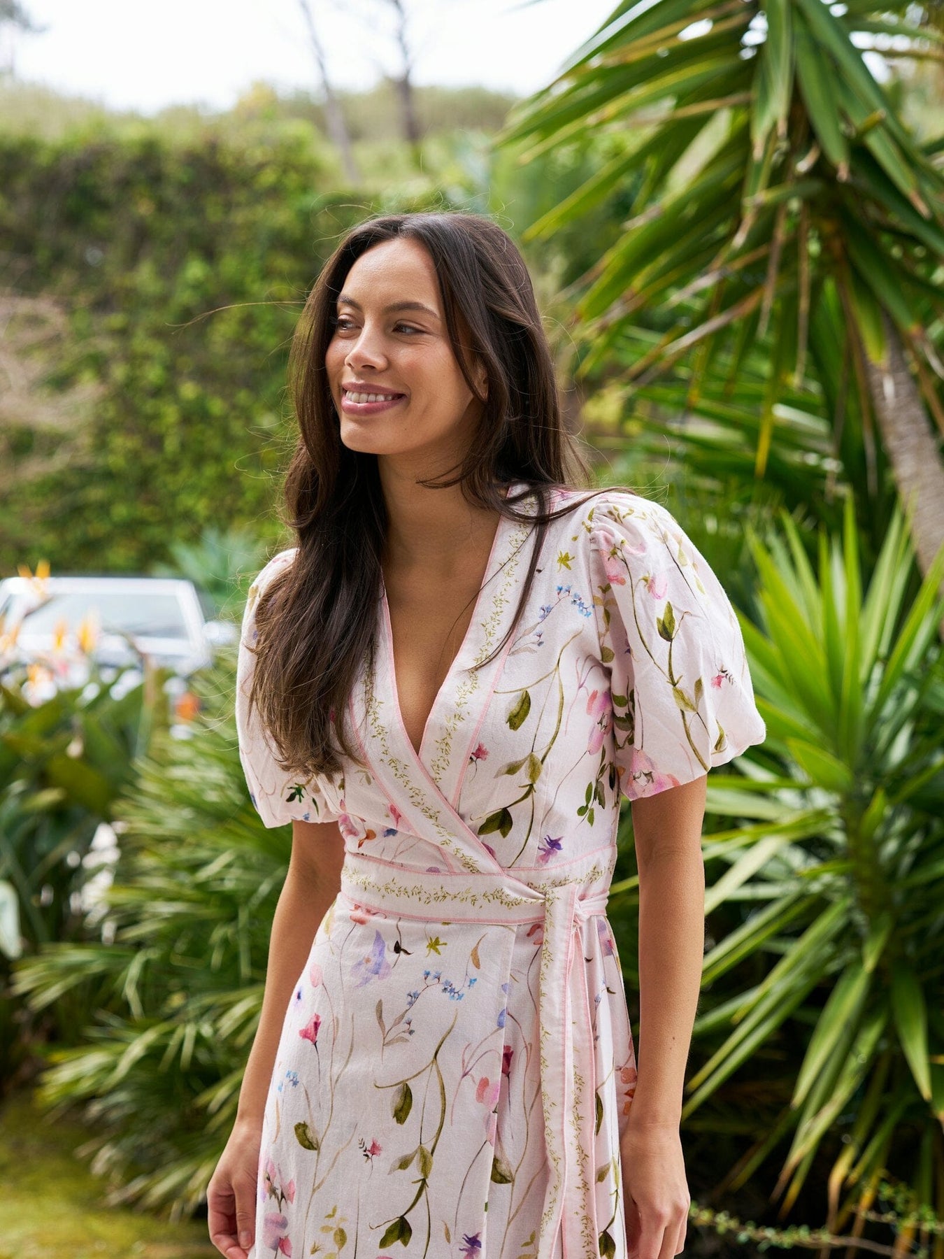 Weißes Kleid von Neo Noir mit farbenfrohem Blumenprint. Das Kleid hat kurze Ärmel und einen V-Ausschnitt.