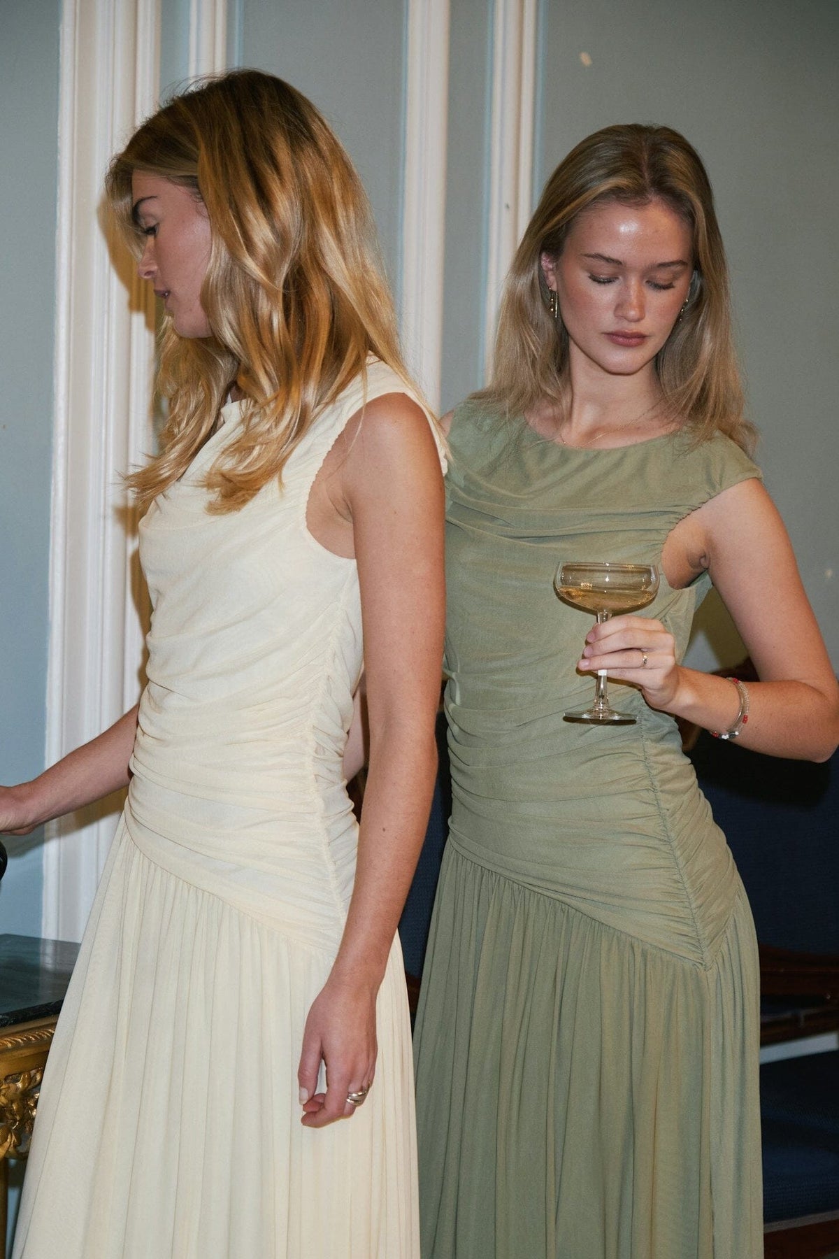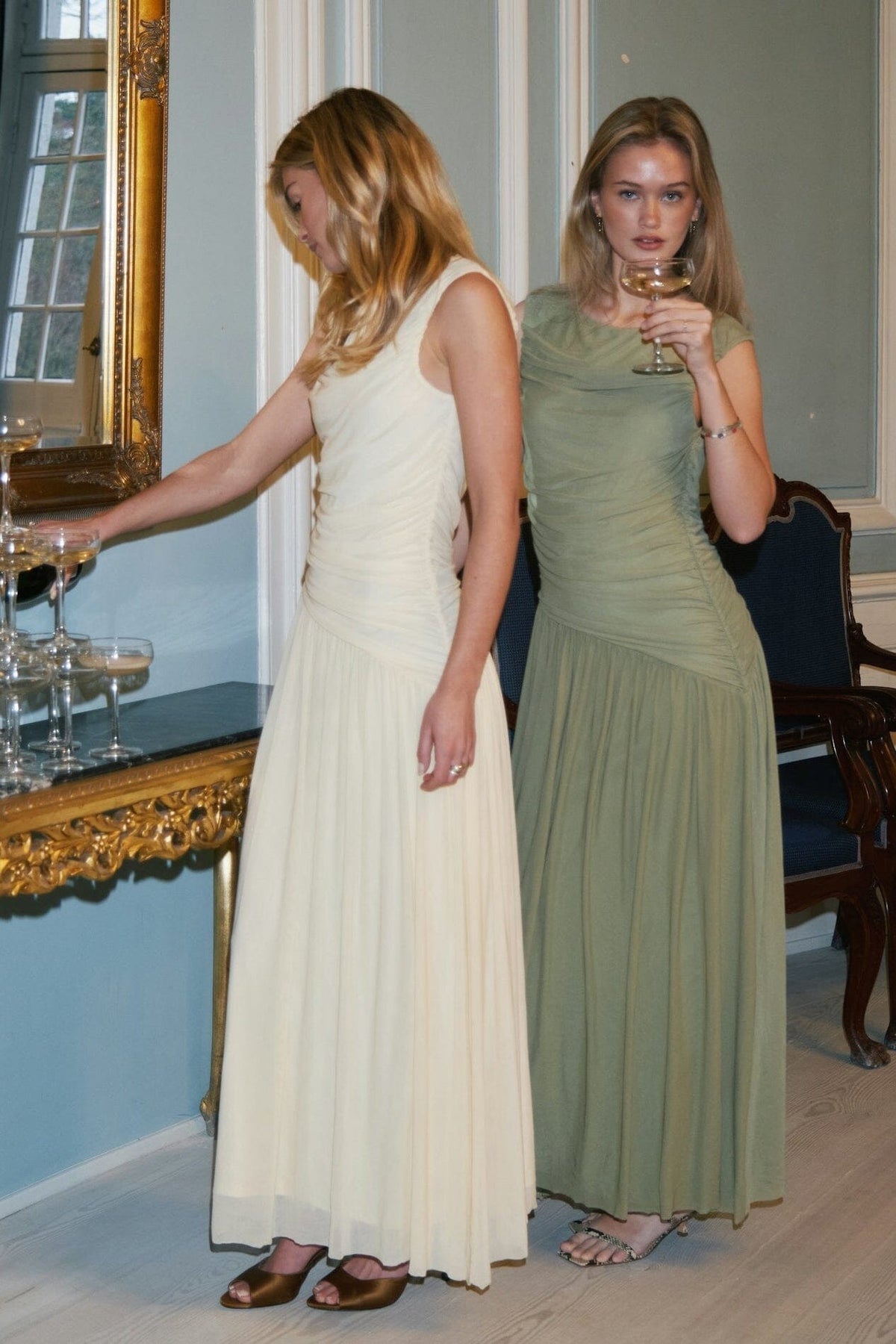 Meshkleid von Neo Noir in Salbeigrün. Das Kleid hat Raffungen entlang der Seitennaht und ein lockeres Unterkleid mit asymmetrisch geschnittenem Rockteil.