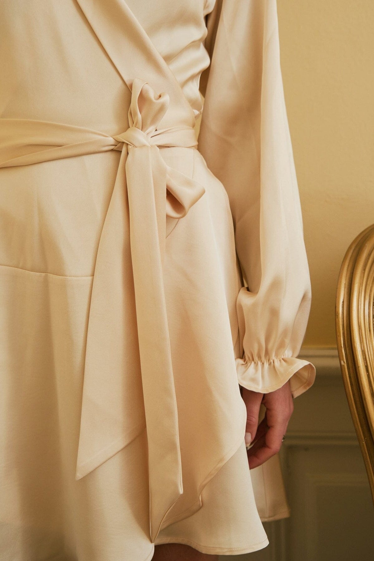 Kurzes Kleid von Neo Noir aus schwerem Satin in einem hellgelben Farbton. Das Kleid hat einen V-Ausschnitt, lange Ärmel und ein Wickeldesign mit Bindegürtel.