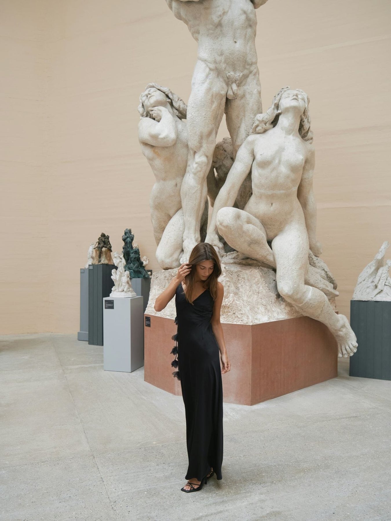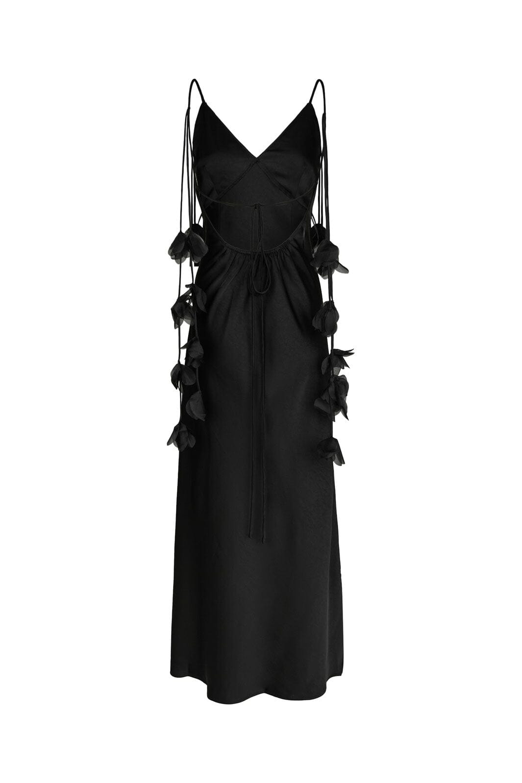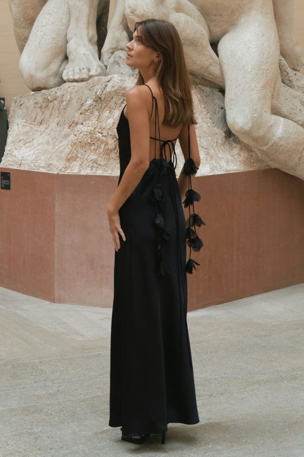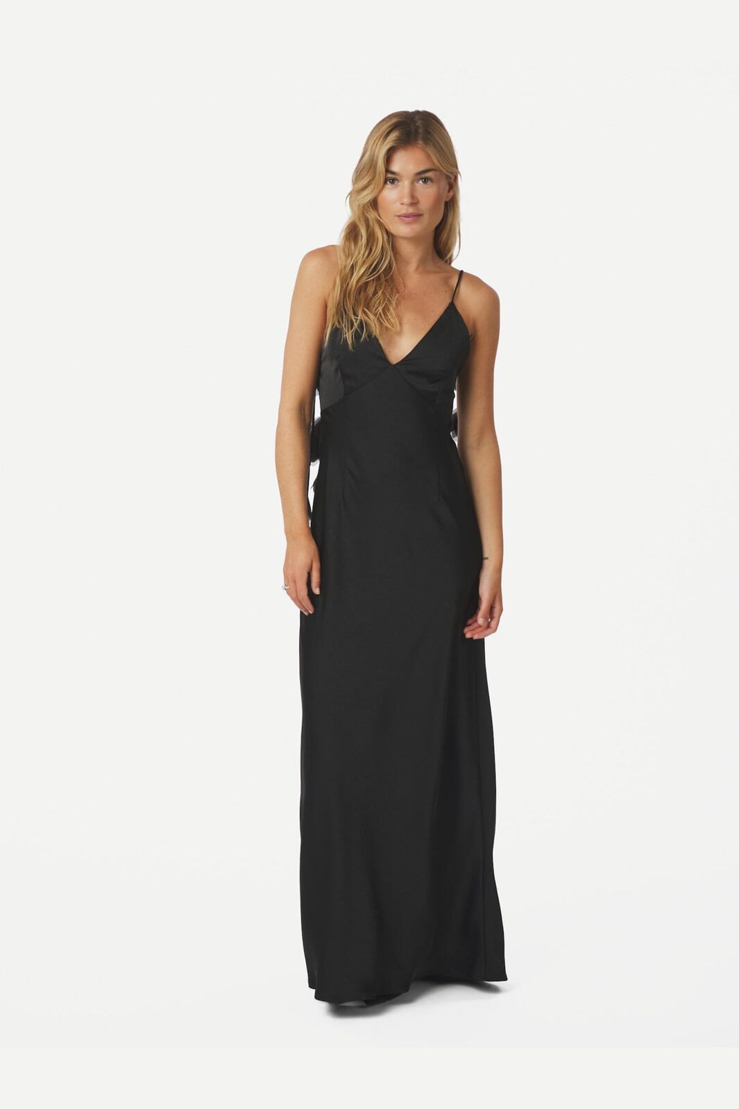 Schwarzes bodenlanges Kleid von Neo Noir aus schwerem Crepe-Satin. Das Kleid hat einen V-Ausschnitt, Spaghettiträger mit Blumendetails und eine Schnürung auf dem Rücken.