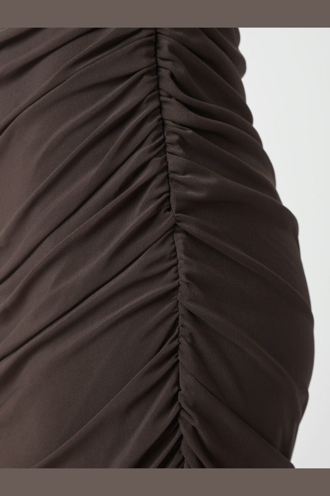 Braunes Mesh-Kleid von Neo Noir mit Rüschendetails an den Seiten. Das Kleid hat eine figurbetonte Silhouette, einen runden Ausschnitt und ein ärmelloses Design mit Schlüsselöffnungsverschluss auf der Rückseite.