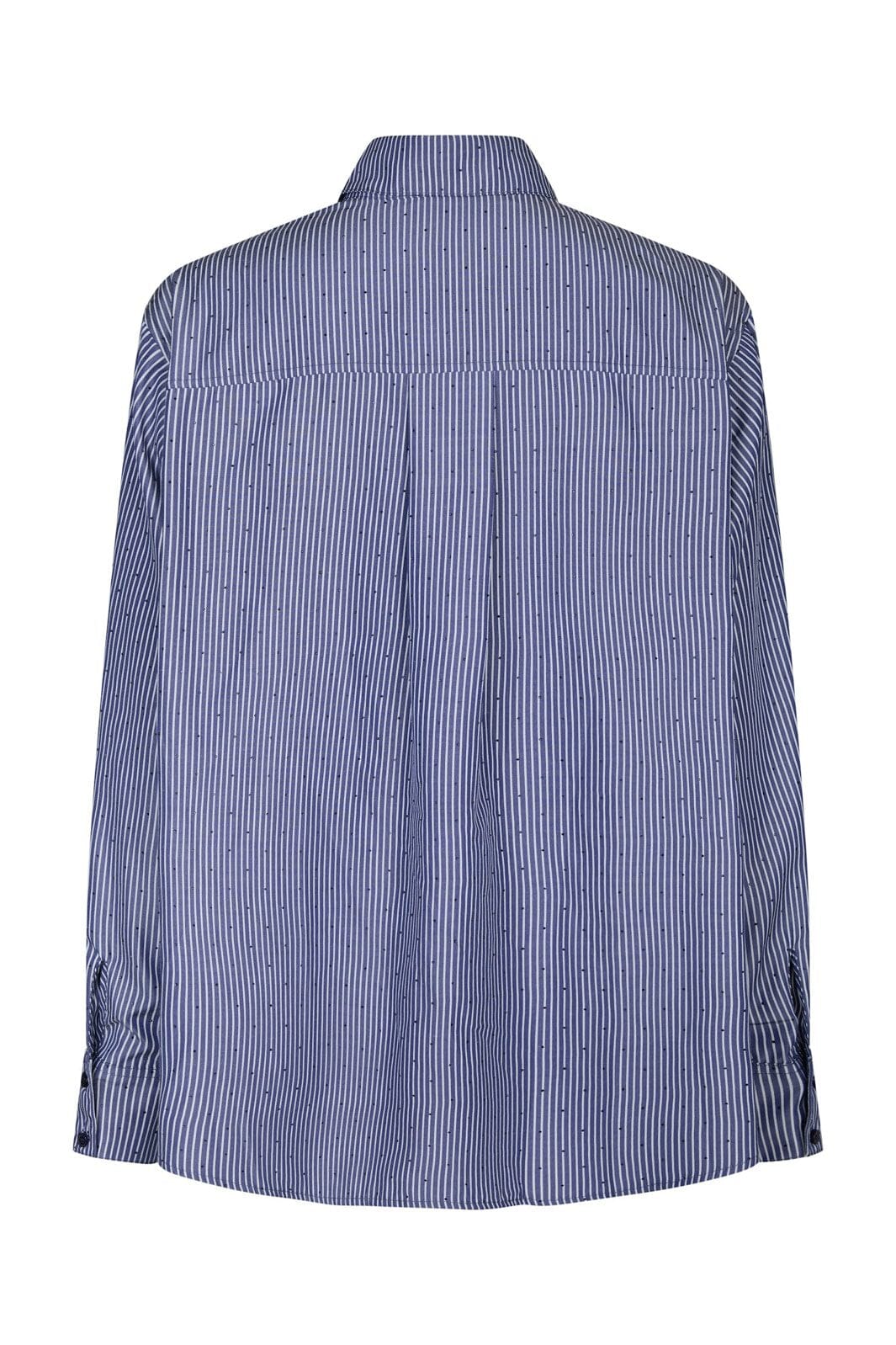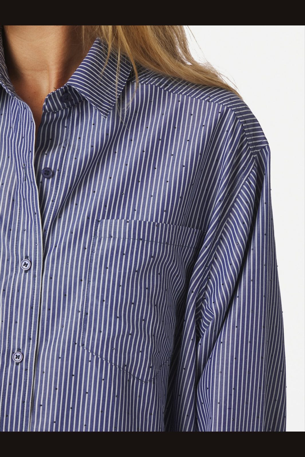 Dunkelblaue Bluse von Neo Noir mit Streifen und Glitzersteinen. Die Bluse hat eine Oversize-Passform und kombiniert klassische Streifen mit kleinen Punkten und Glitzerdetails.