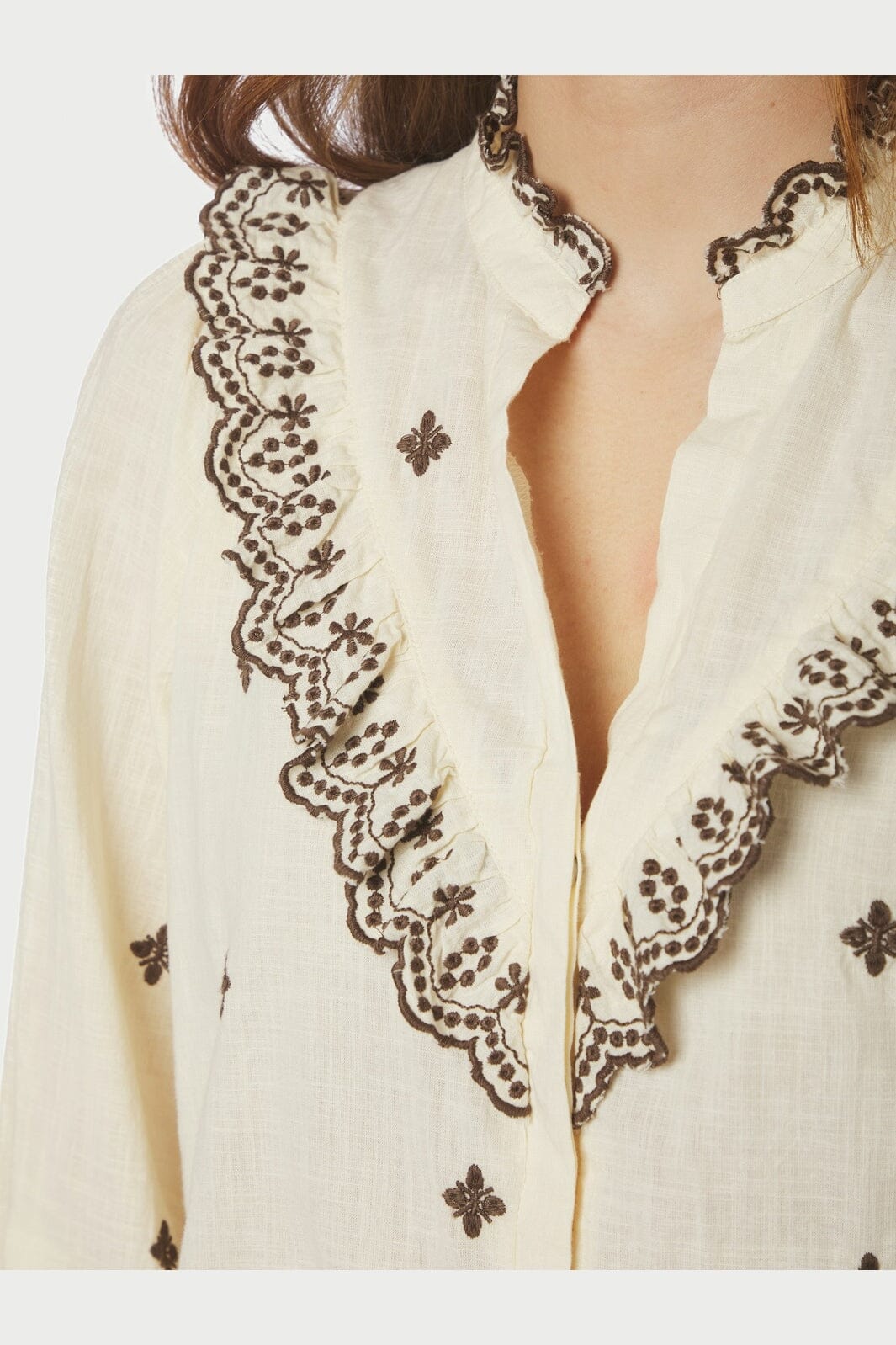Bluse von Neo Noir aus hellgelber Baumwolle mit braunen, gestickten Blumen und Spitzenband entlang des V-Ausschnitts und der Manschetten.