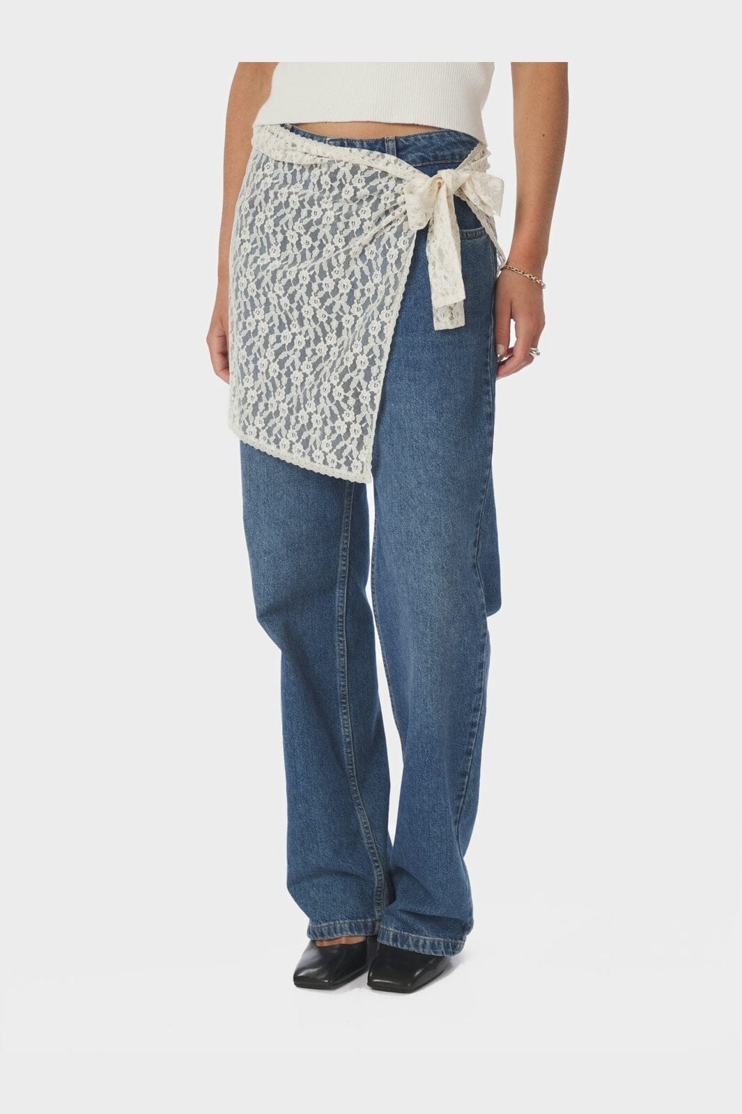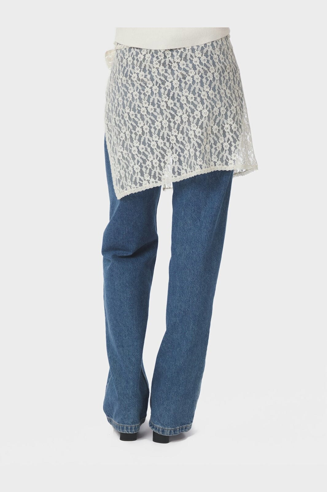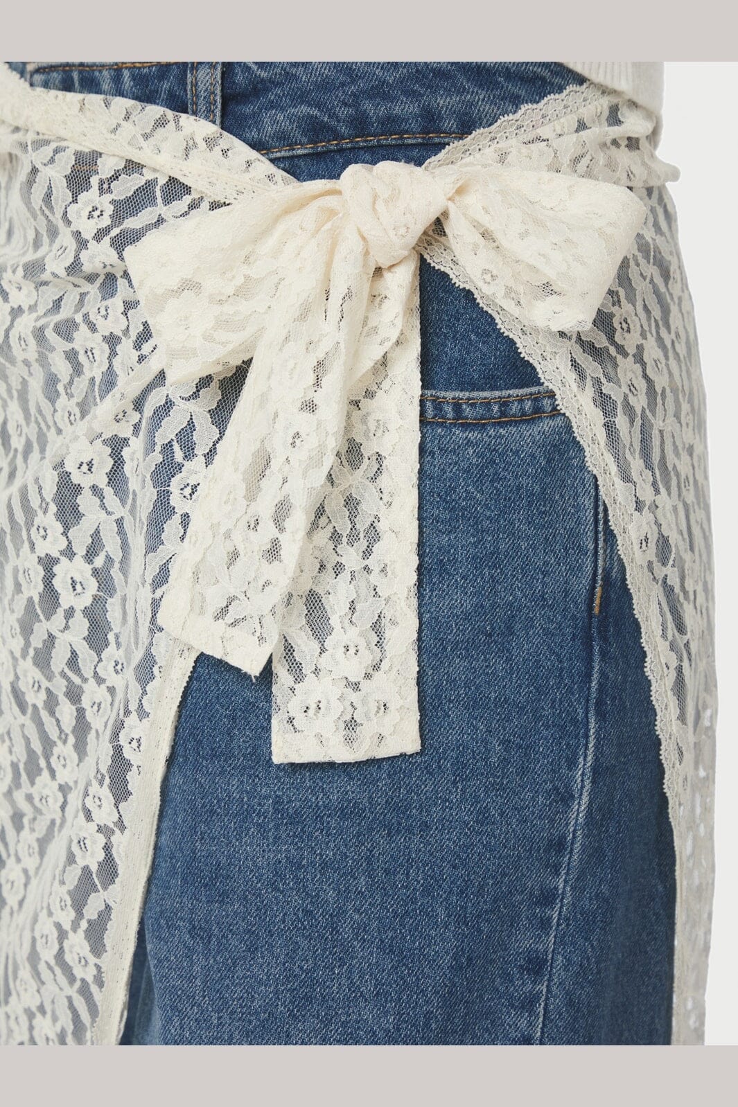 Wickelrock von Neo Noir in cremefarbener Spitze. Der Rock hat ein blumiges Muster und wird an der Seite gebunden.