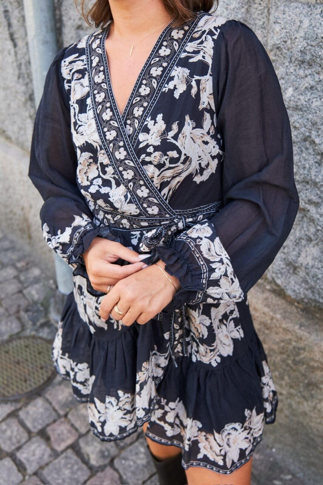 Dunkelblaue Wickelkleid von Neo Noir mit weißem Blumenmuster. Das Kleid hat einen V-Ausschnitt, lange Puffärmel und Rüschen. Das Bindeband in der Taille ermöglicht eine Anpassung der Passform.