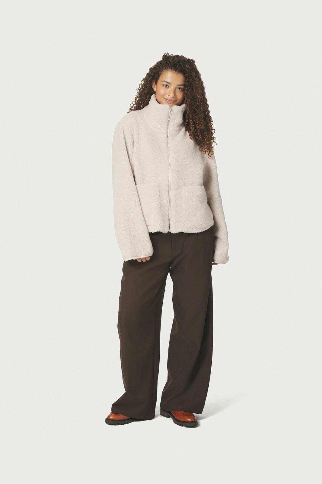 Teddyjacke von Neo Noir in einem weichen elfenbeinfarbenen Ton. Die Jacke hat einen hohen Kragen und eine lockere Passform, die sowohl für zu Hause als auch für den Alltag geeignet ist.