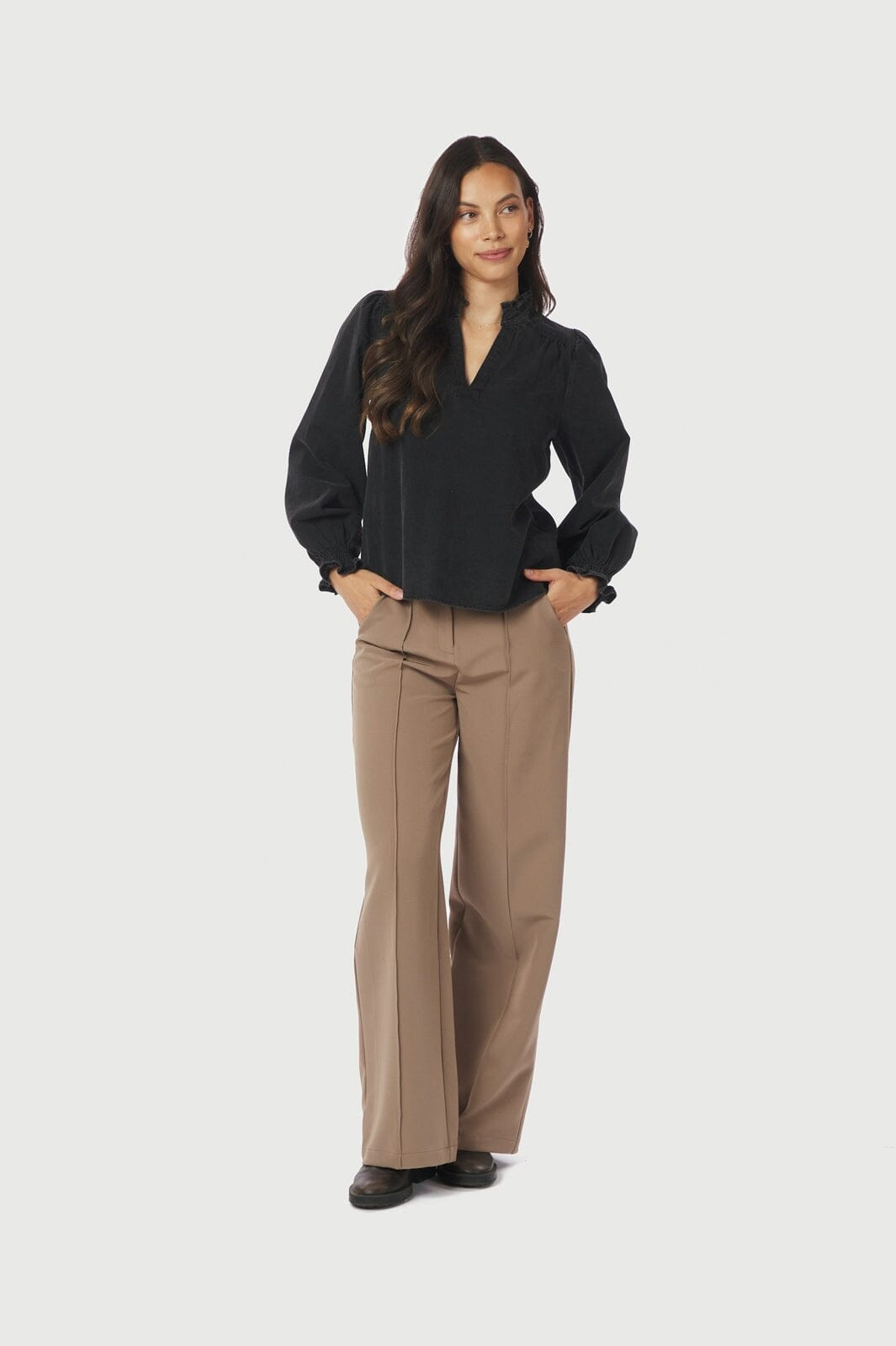 Schwarze Denimbluse von Neo Noir mit V-Ausschnitt und gerafftem Halsauschnitt. Die Bluse hat lange Ärmel mit Smock an den Manschetten und eine Schnürung vorne.