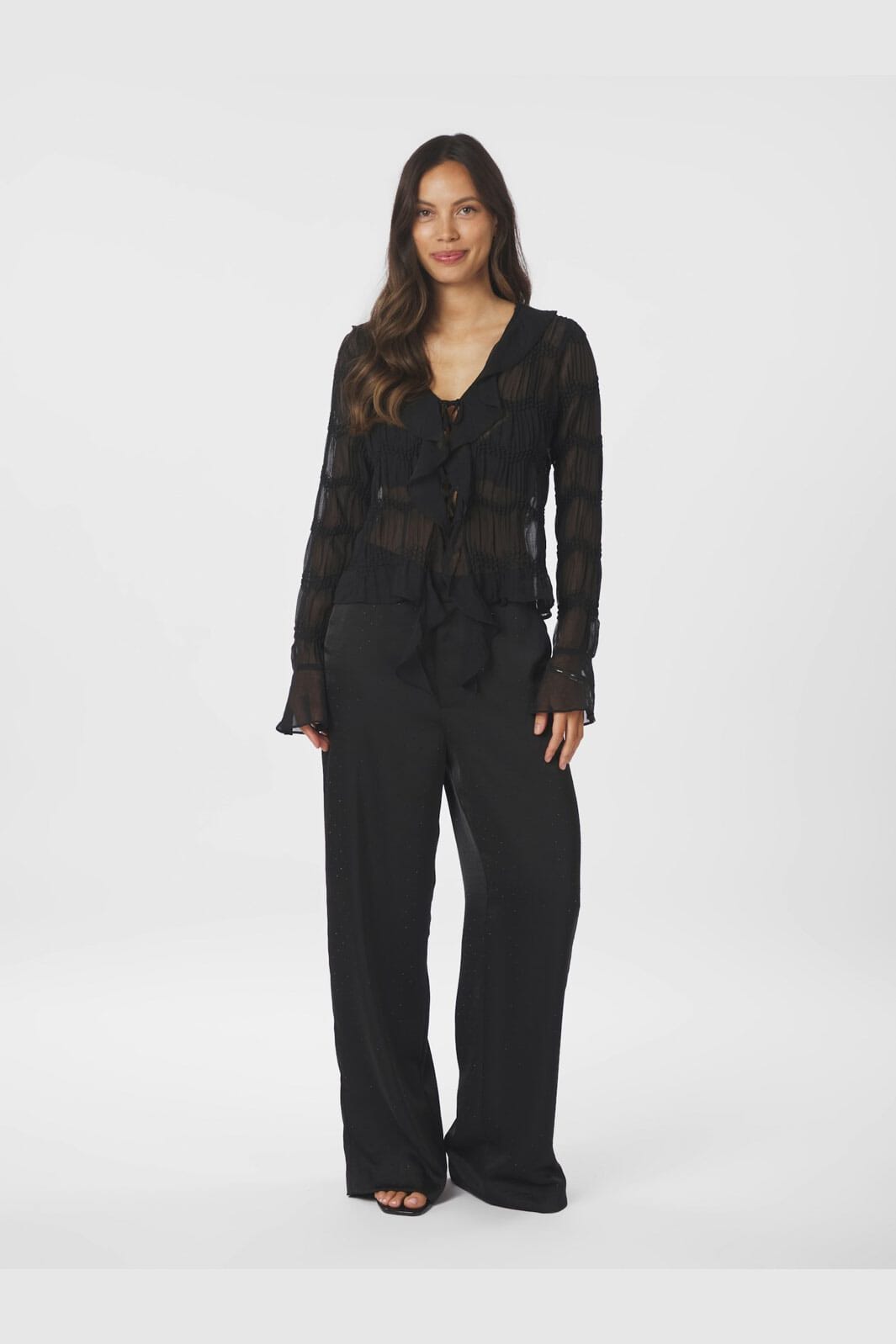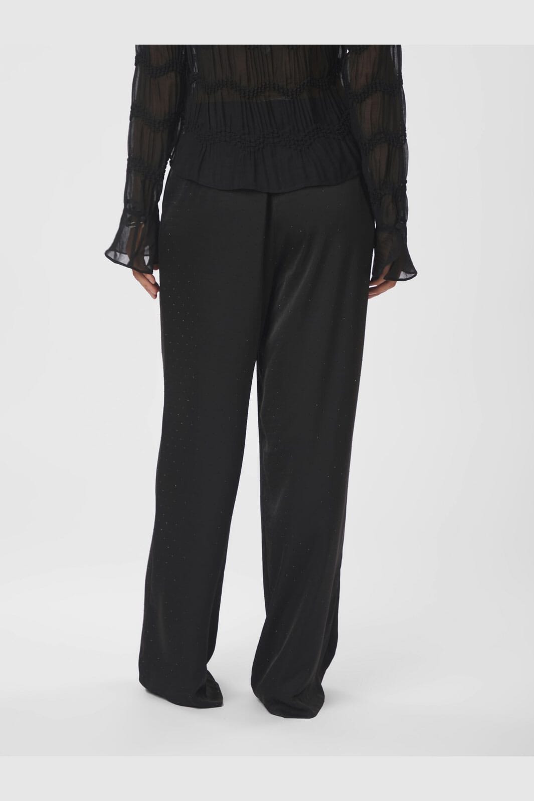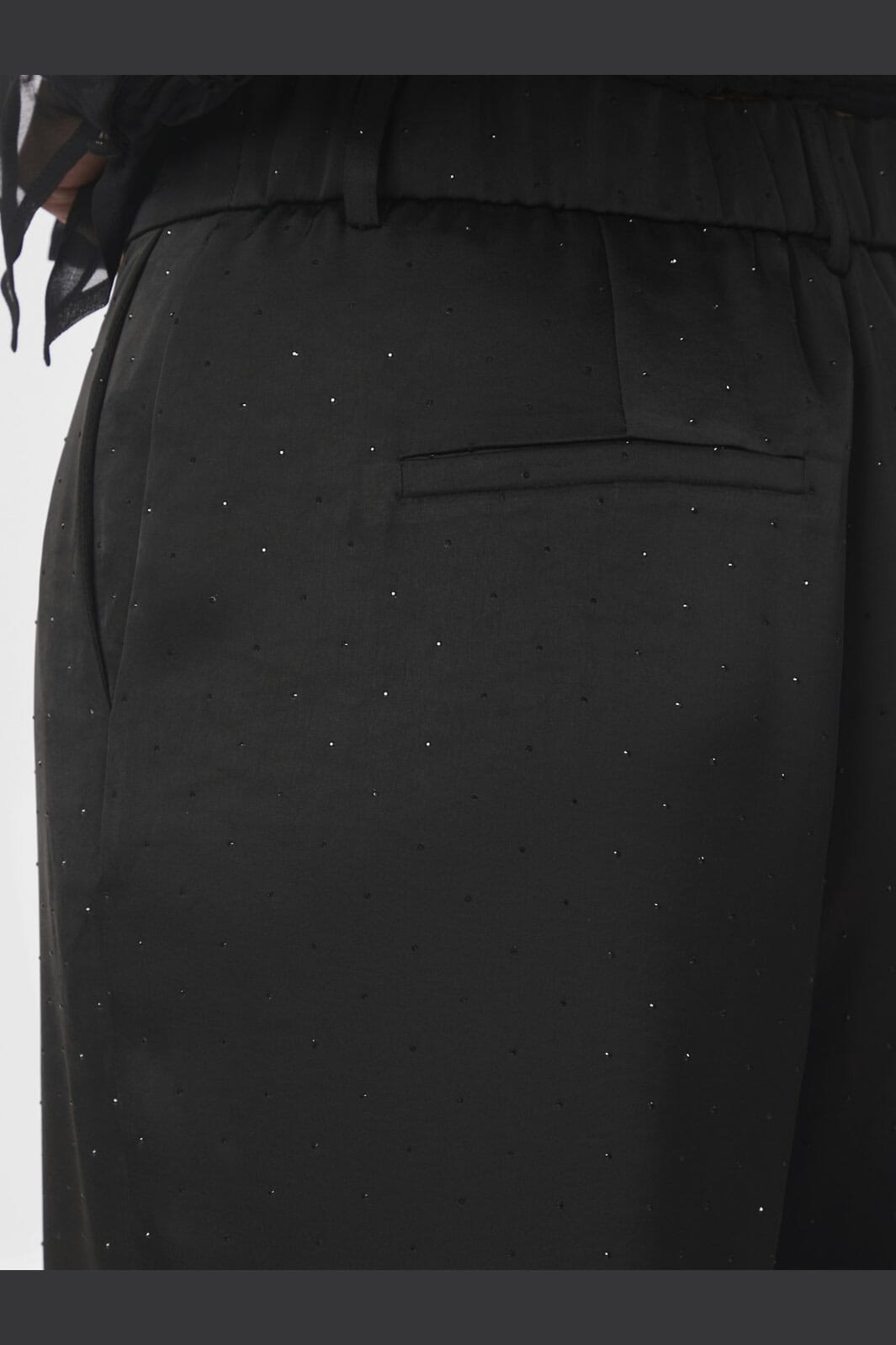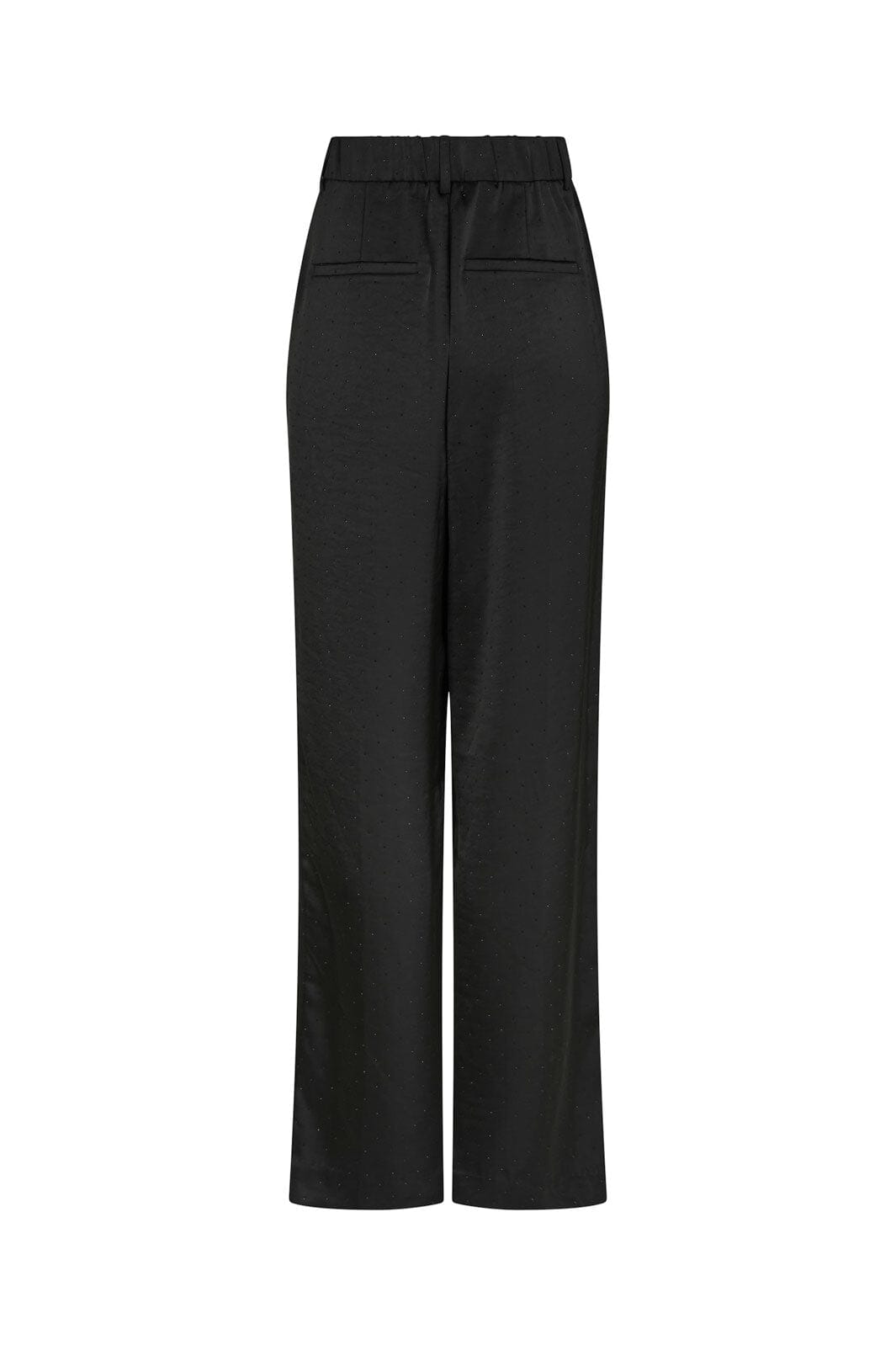 Schwarze Hosen von Neo Noir aus schwerem Satin mit aufgenähten Steinen. Die Hosen haben eine hohe Taille und eine weite Passform, die bis zum Boden reicht.