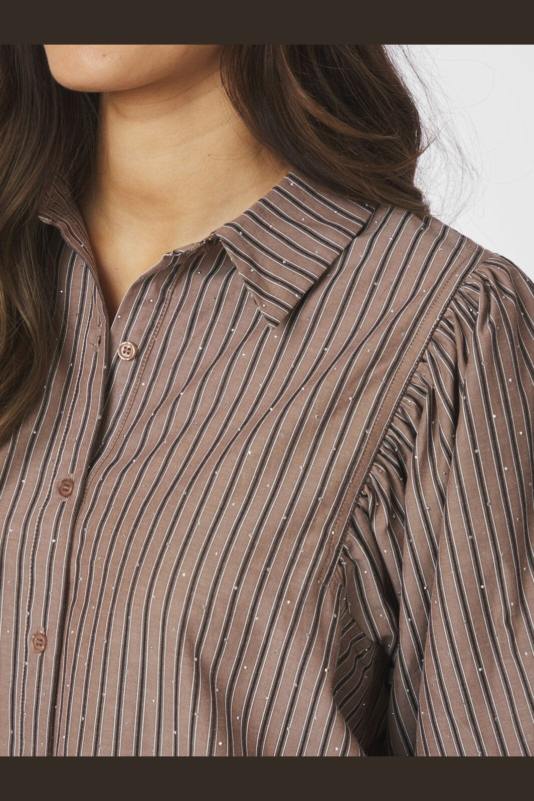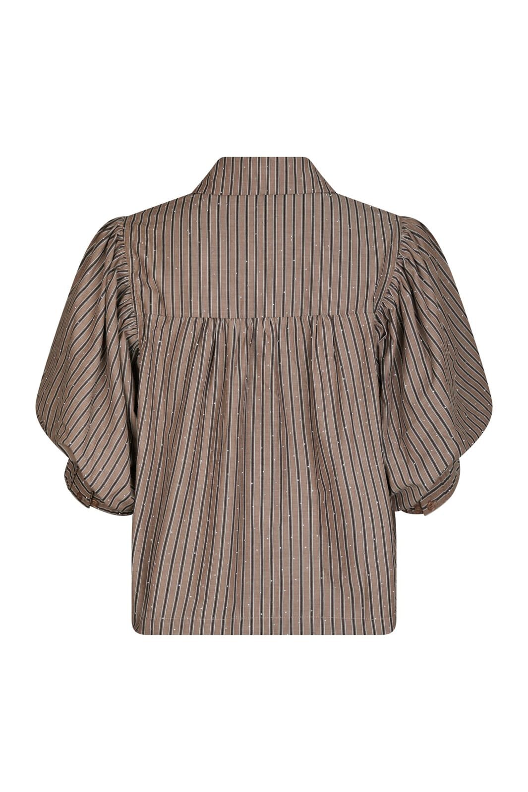 Braun gestreifte Bluse von Neo Noir mit kurzen Puffärmeln. Die Bluse hat vertikale Streifen in Brauntönen, dekorative Nähte sowie Rüschen, die ihr eine persönliche Note verleihen.