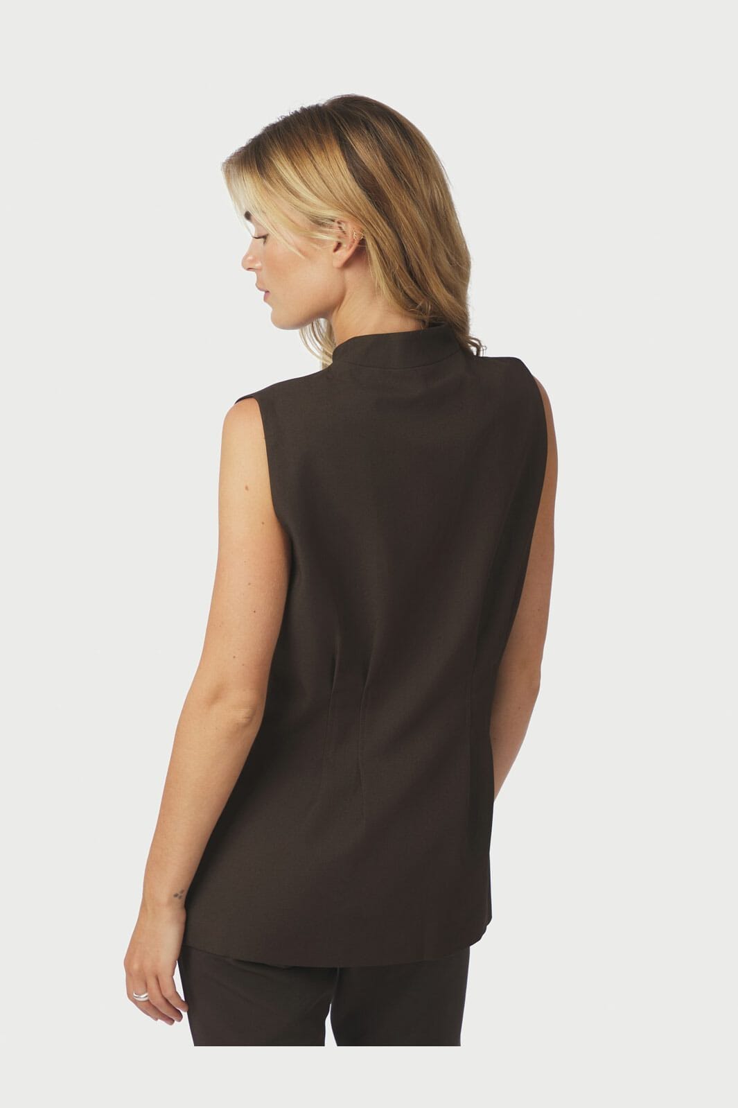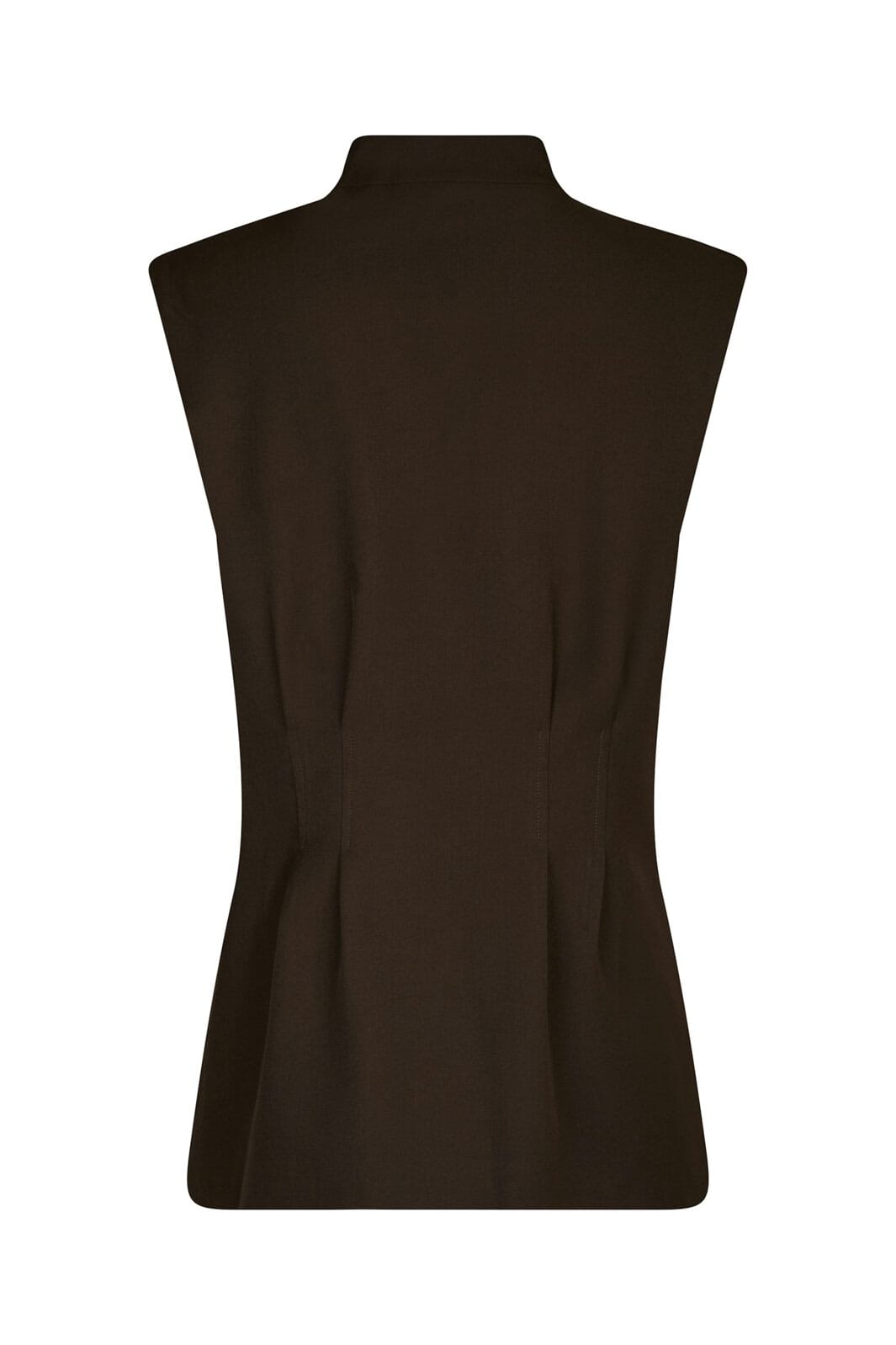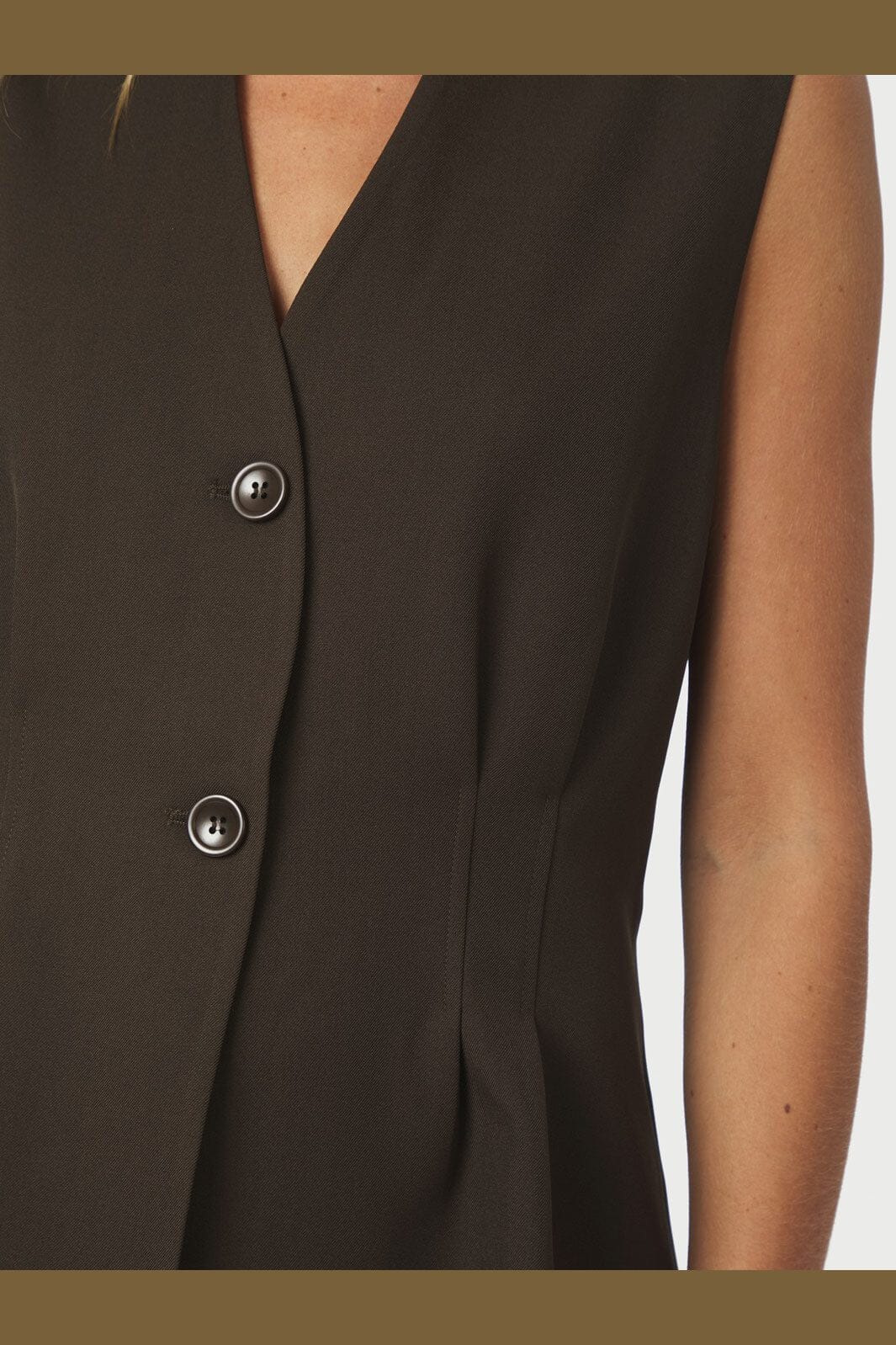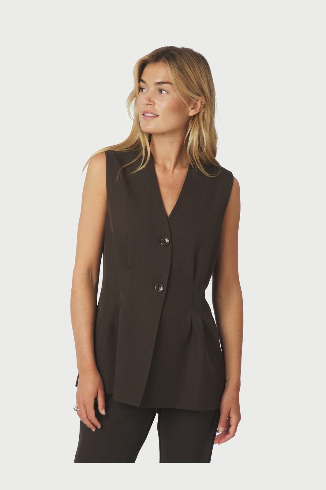 Dunkelbraune Weste von Neo Noir in strukturierter Qualität. Die taillierte Weste hat einen V-Ausschnitt und zwei Knöpfe vorne. Die Weste kann sowohl im Alltag als auch zu festlichen Anlässen getragen werden.