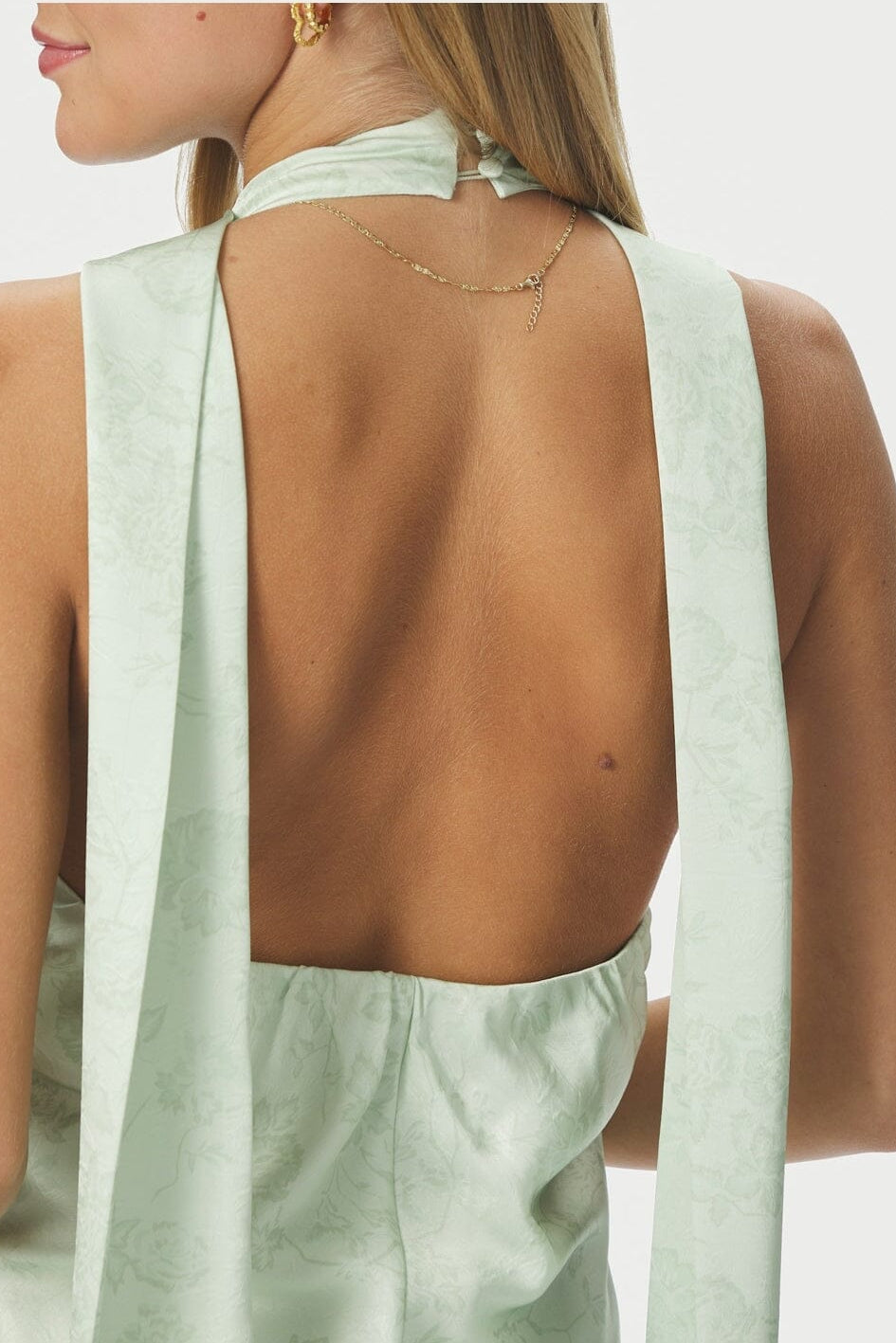 Satinkleid von Neo Noir in Hellgrün mit Blumenmuster. Das Kleid besteht aus glänzendem Satin und hat einen langen Halterneck-Stil mit offenem Rücken.