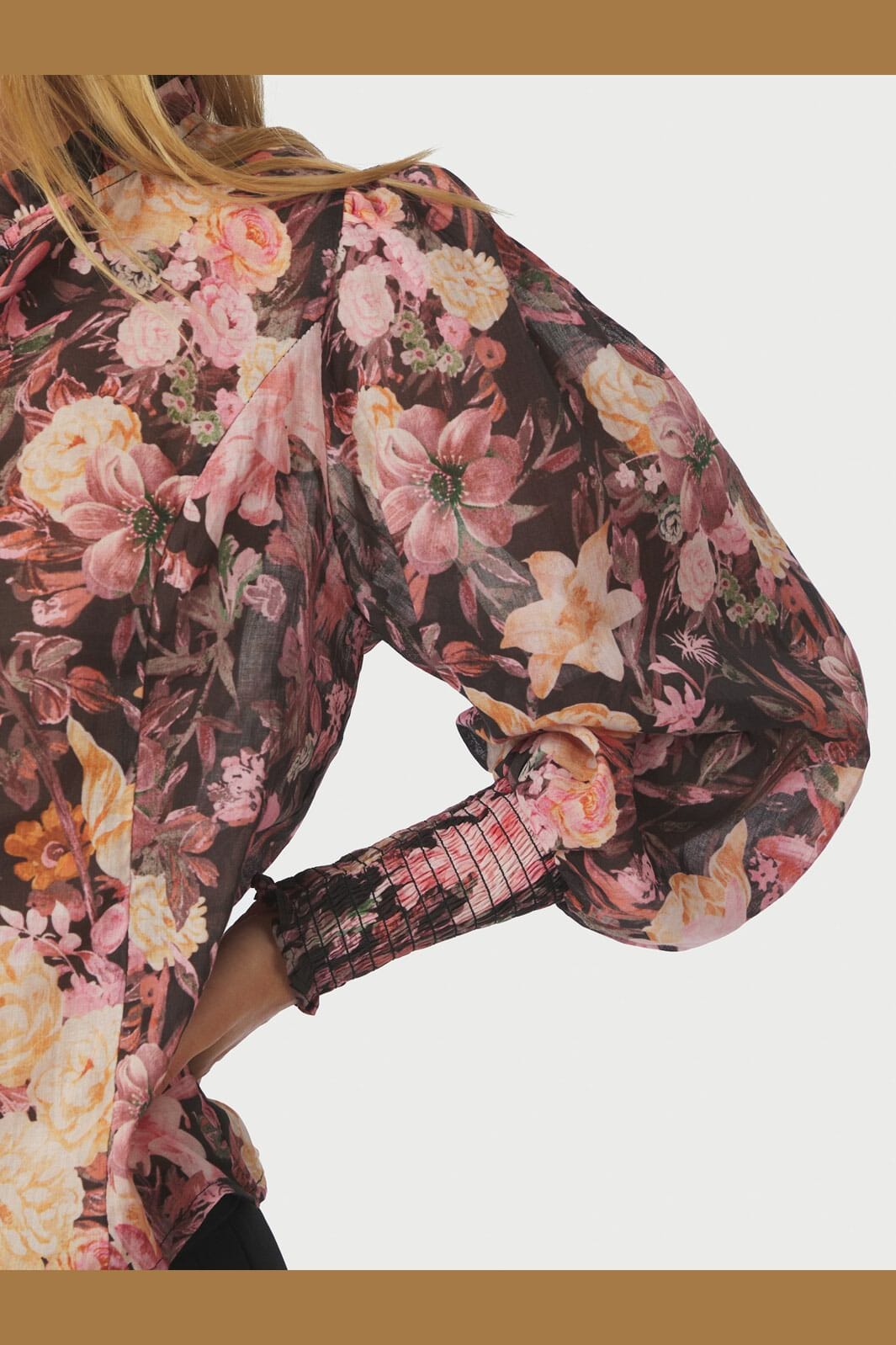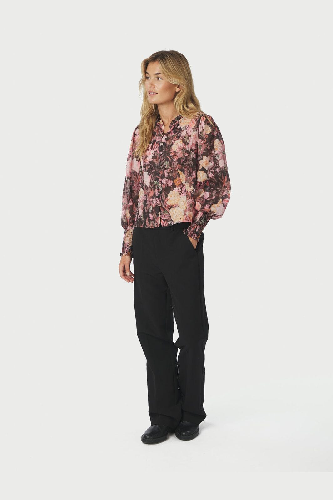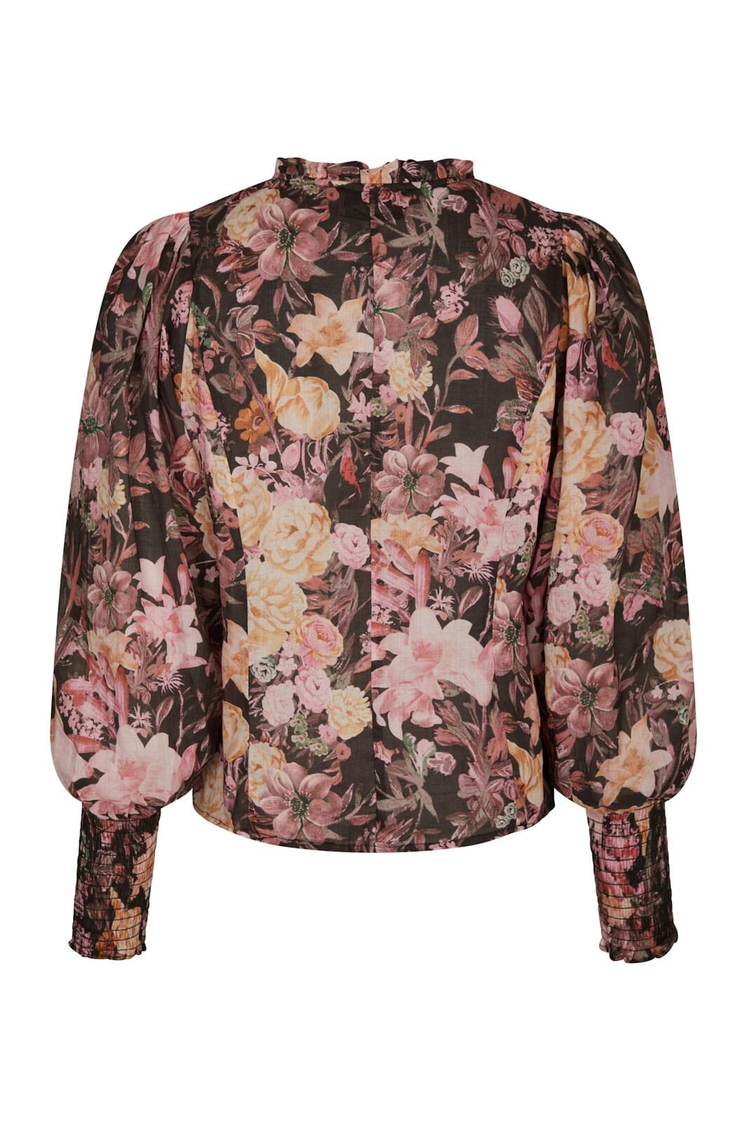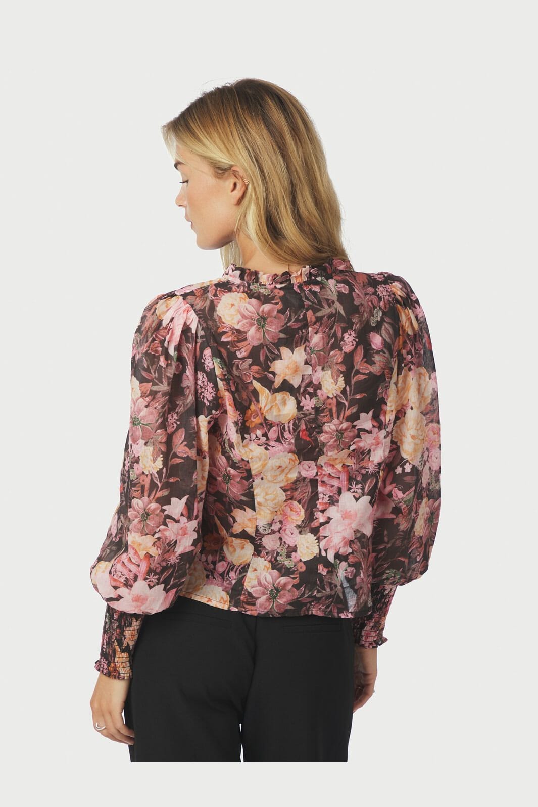 Schwarze Bluse von Neo Noir mit Blumenmuster in Pink und Creme. Die Bluse hat einen hohen Kragen mit Rüschen, puffige Ärmel und eine Knopfleiste vorne.