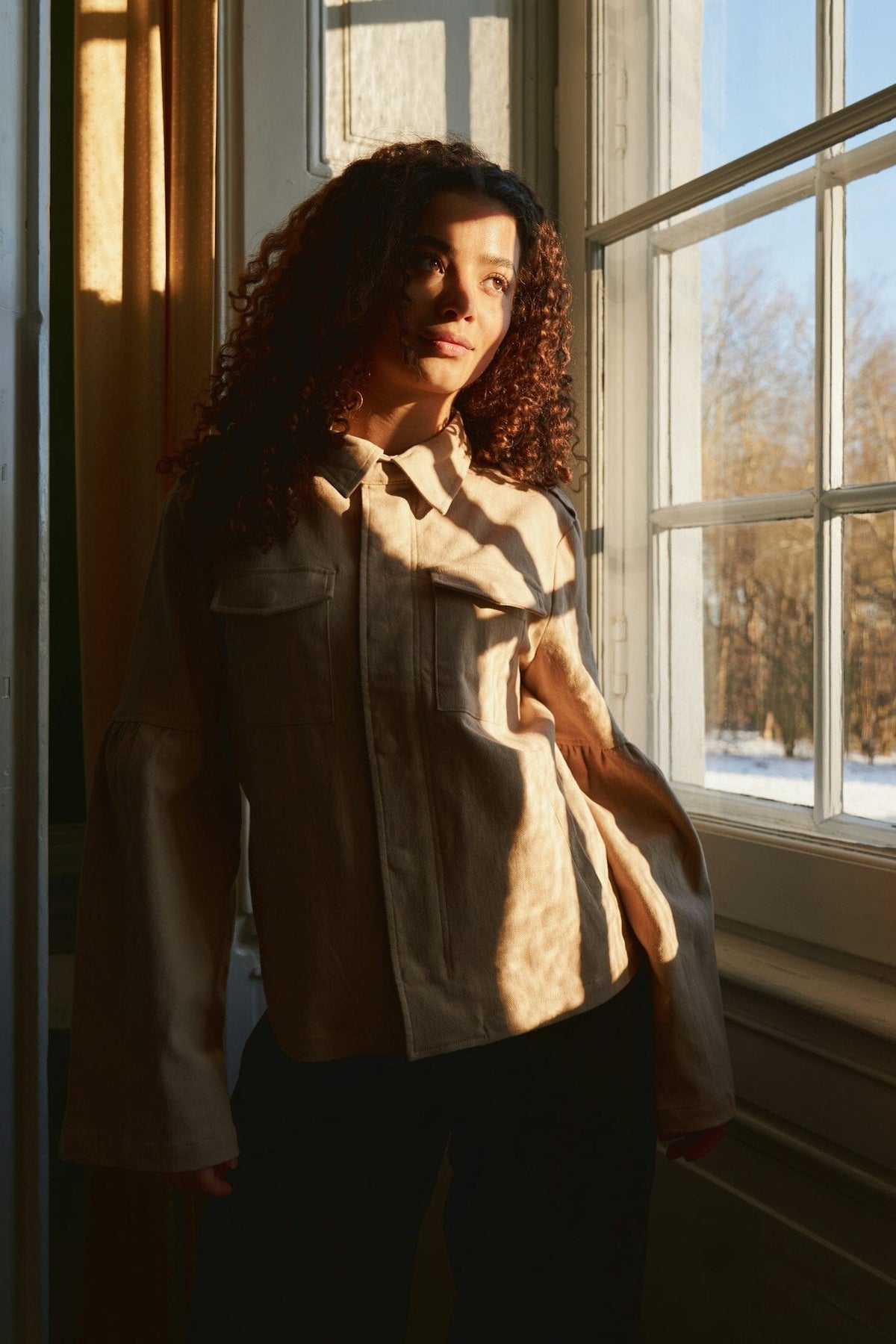 Sandfarbene Jacke von Neo Noir, gefertigt aus 90 % Baumwolle, 8 % Polyester und 2 % Elasthan. Die Jacke hat einen klassischen Hemdkragen, zwei Brusttaschen mit Patten und lange Ärmel mit Puffdetail an den Schultern.