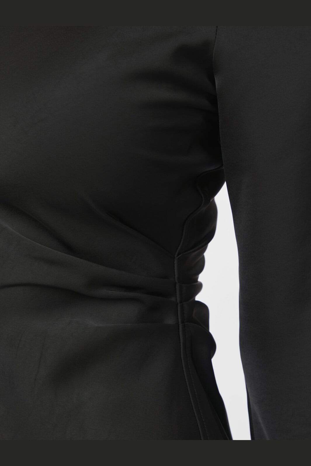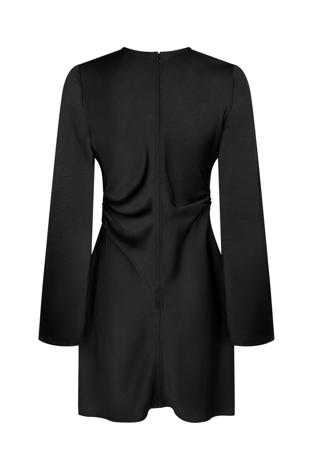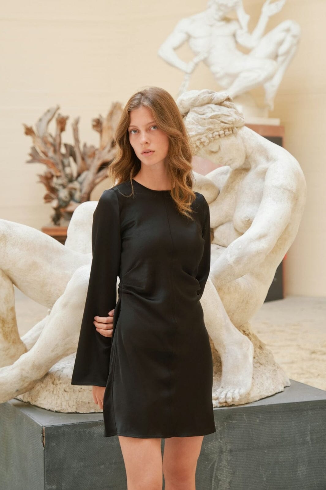 Schwarzes Satin-Kleid mit figurbetonter Silhouette und langen Ärmeln. Das Kleid hat Rüschendetails und Weite in den Ärmeln. Ein Reißverschluss auf der Rückseite macht es einfach, es anzuziehen und auszuziehen.