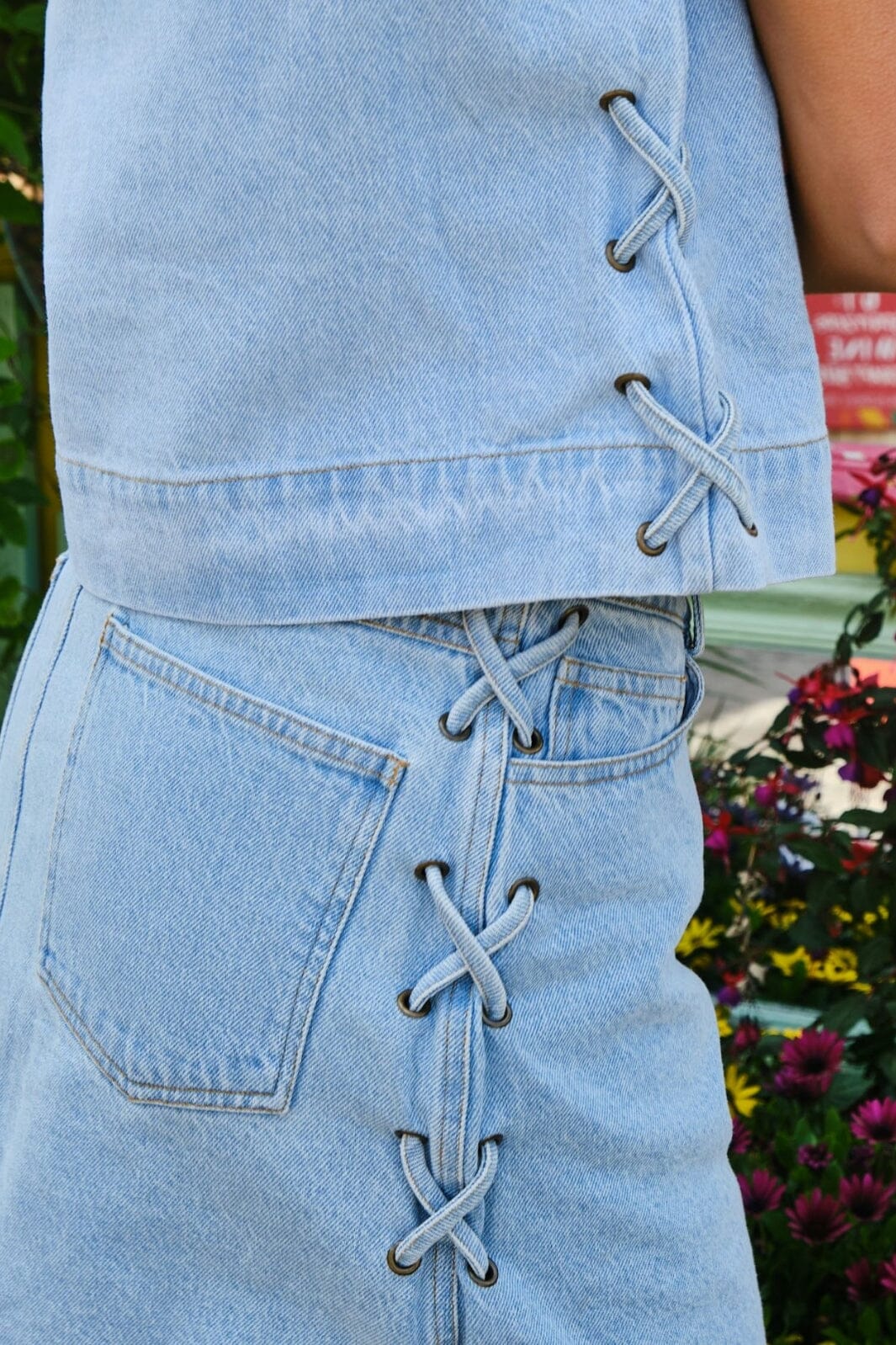 Denimrock von Neo Noir in hellblauer Farbe. Der Rock hat Schnürdetails an den Seiten und eine praktische Kombination aus Reißverschluss und Knopfverschluss.
