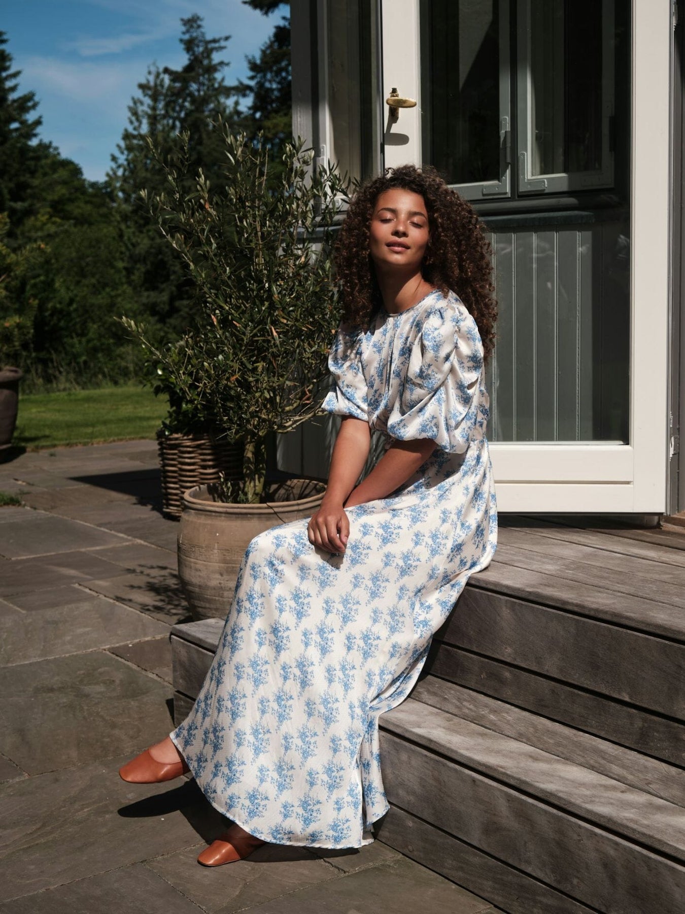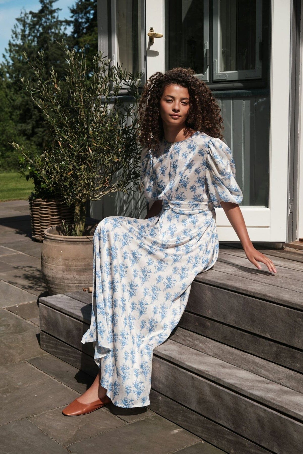 Knöchellanges Kleid von Neo Noir in Weiß mit hellblauen Blumen. Das Kleid hat hinten einen Smock an der Taille und 3/4-Ärmel mit Puff. Rundhalsausschnitt mit Knopfverschluss im Nacken.