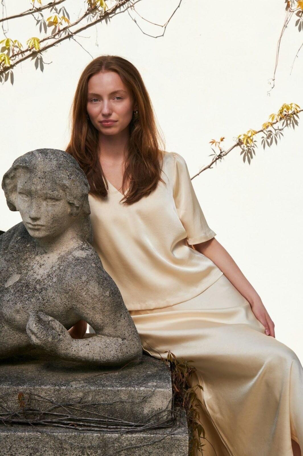 Helle gelbe Bluse von Neo Noir in Satinqualität. Die Bluse hat kurze Ärmel, Schulterpolster und einen V-Ausschnitt. Der Satin-Stoff verleiht einen glänzenden Look, der sowohl für den Alltag als auch für Feste geeignet ist.