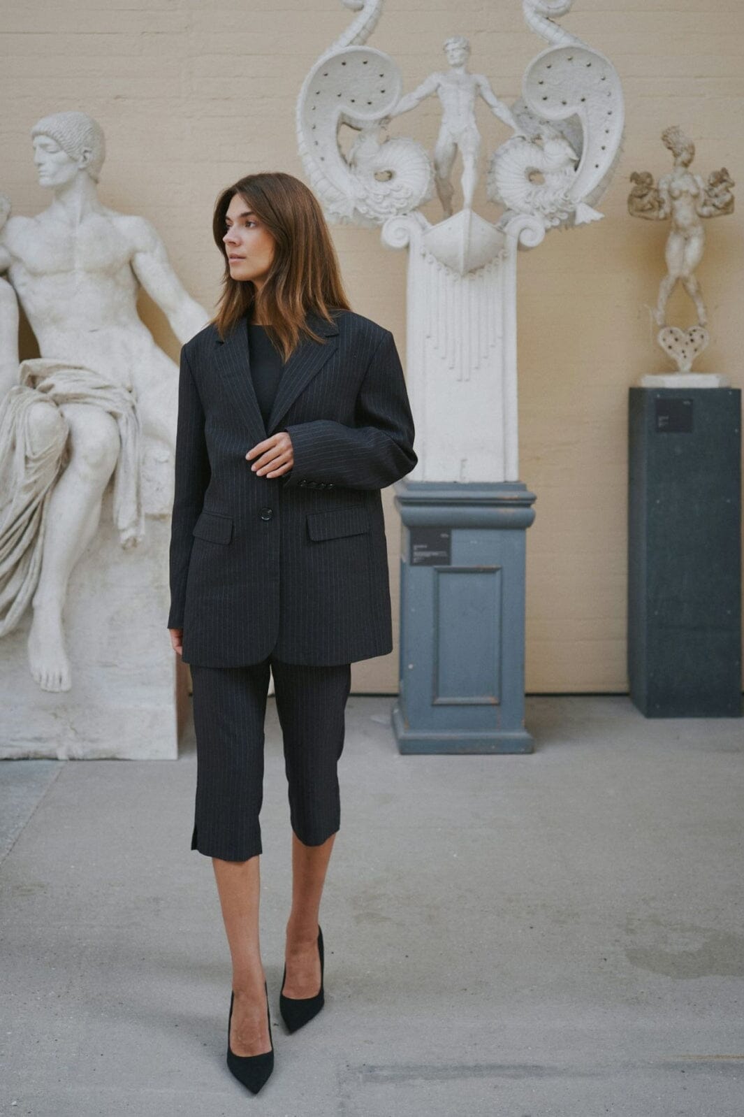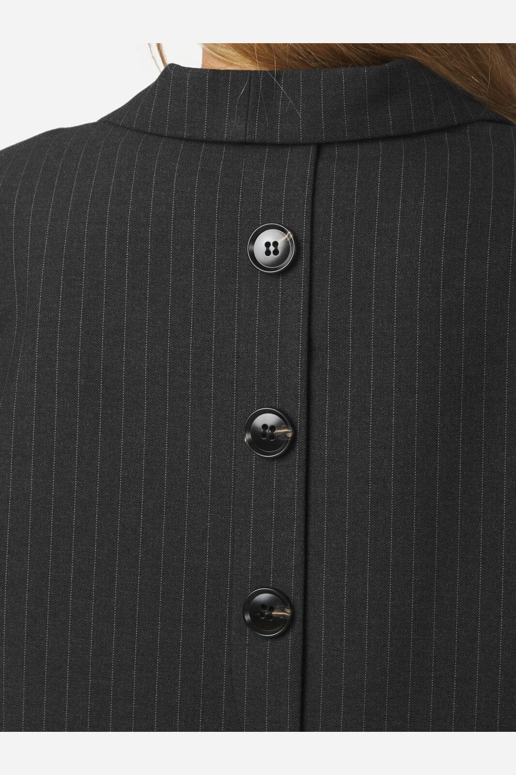 Anthrazitfarbener Blazer von Neo Noir mit Nadelstreifenmuster. Er hat eine oversized Passform und Knöpfe sowohl vorne als auch hinten. Der V-Ausschnitt und die langen Ärmel verleihen dem Blazer einen klassischen Schnitt.