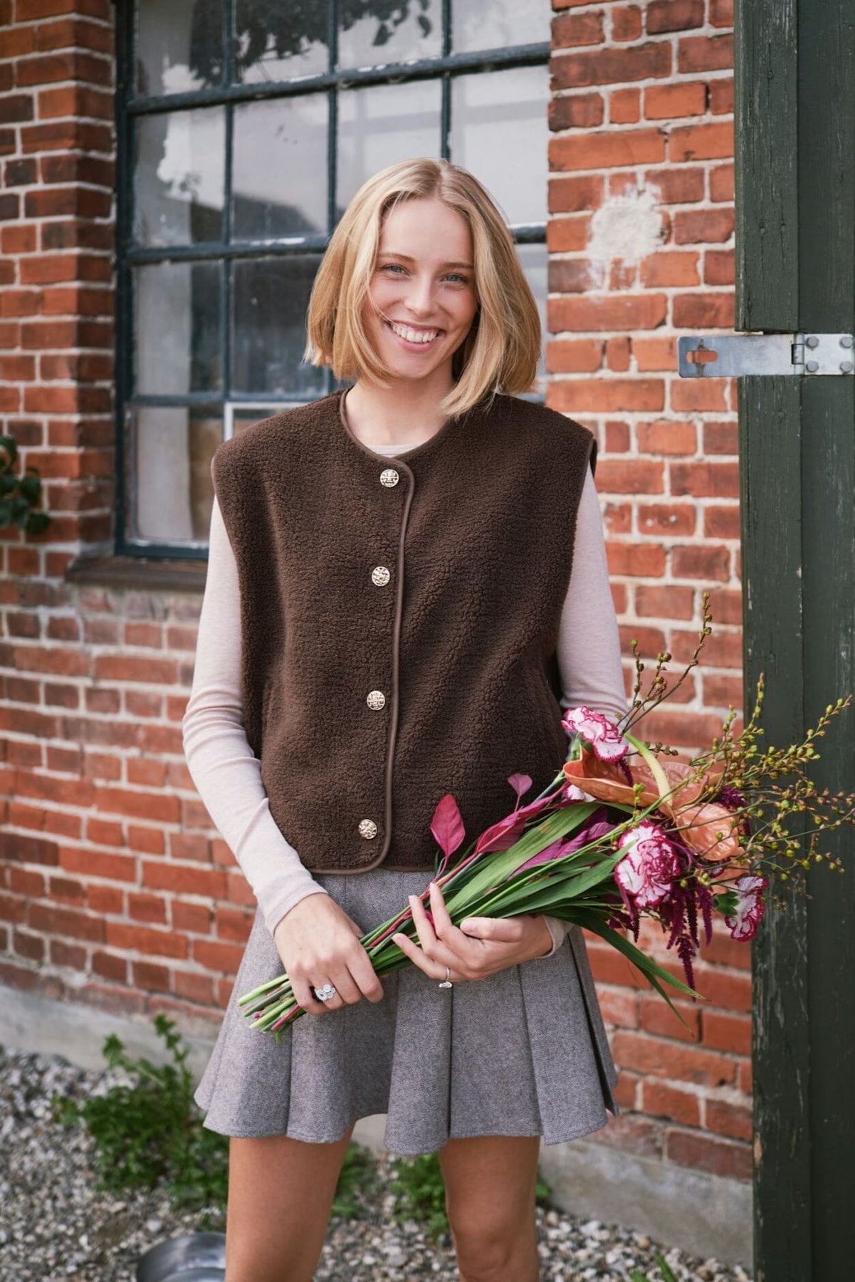Dunkelbraune Teddyweste von Neo Noir mit Rundhalsausschnitt. Die weiche und flauschige Teddy-Textur verleiht der Weste einen warmen und einladenden Ausdruck.