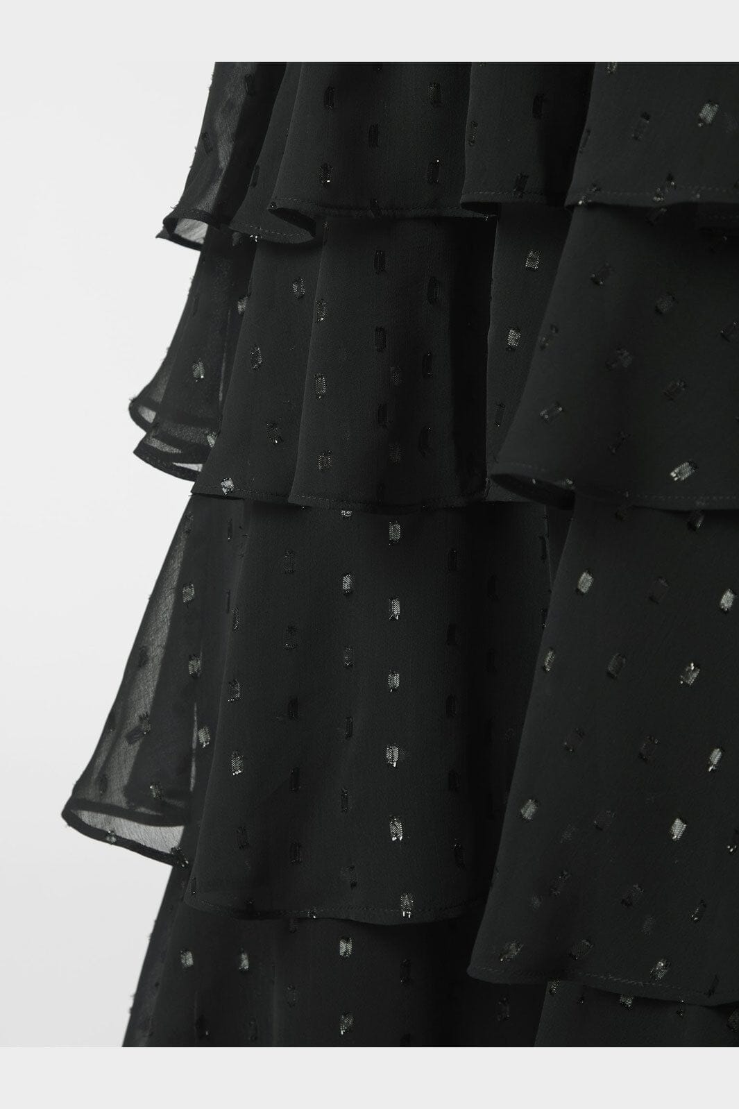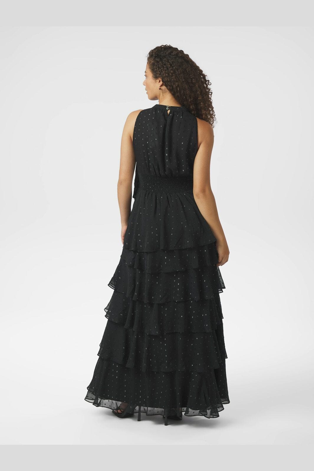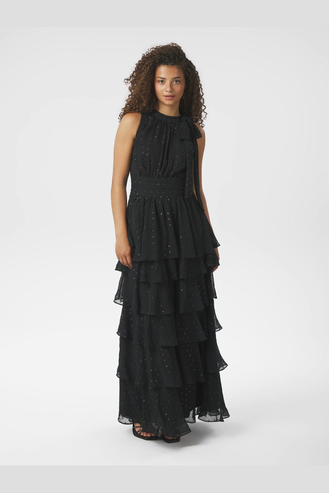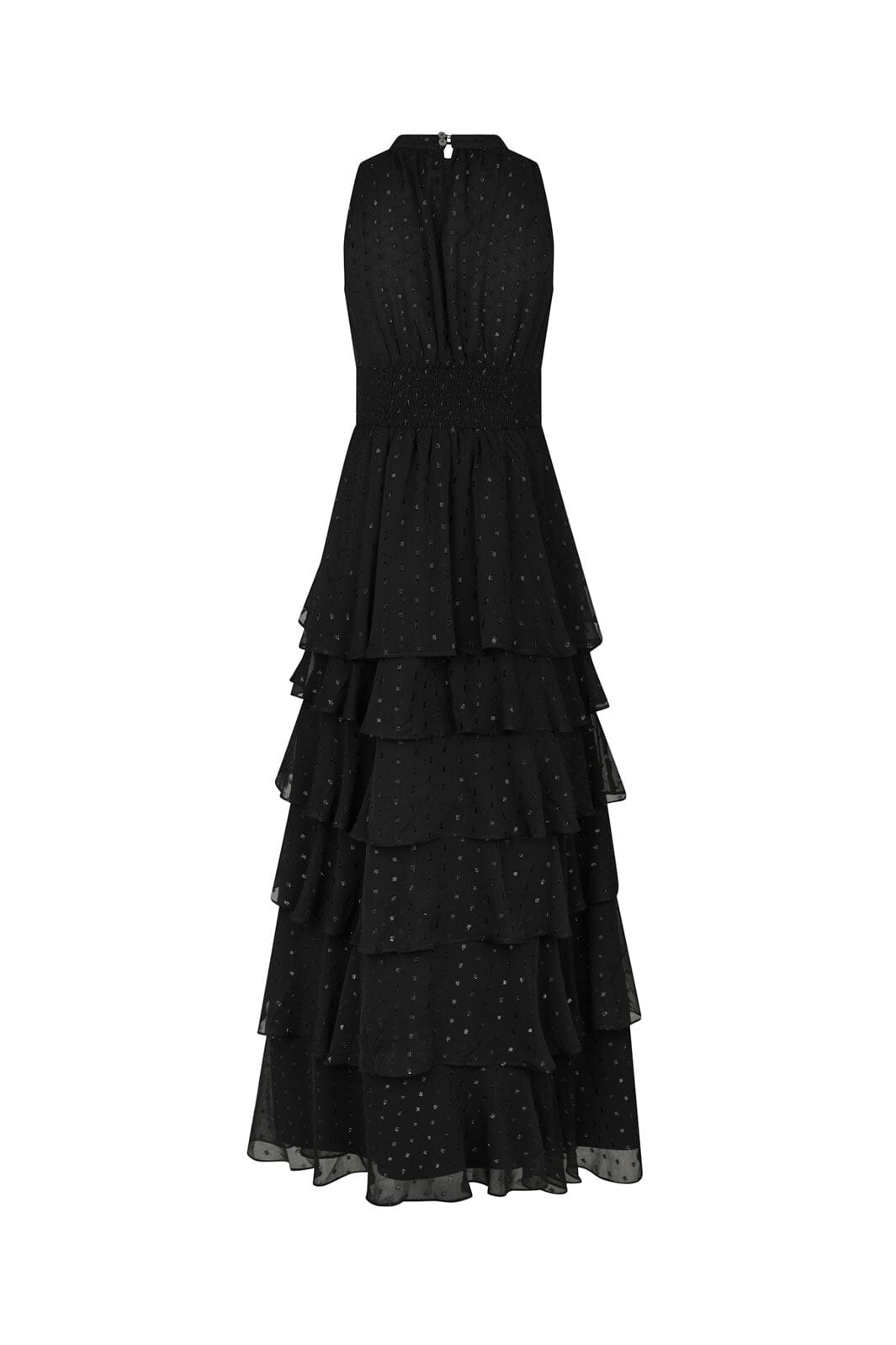 Schwarzes langes Kleid von Neo Noir aus Chiffon-Qualität mit gepunktetem Muster. Das Kleid hat einen hohen Kragen mit Schleife und ist aus mehreren Lagen Stoff mit Rüschen aufgebaut.