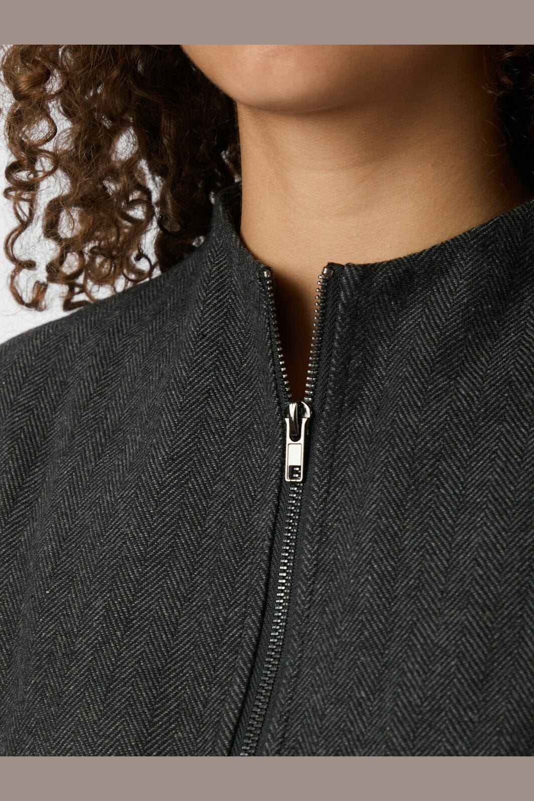Ärmelloses Kleid von Neo Noir aus antrazitfarbenem Stoff mit Fischgrätenmuster. Das Kleid hat einen hohen Kragen und einen praktischen Reißverschluss vorne. Es eignet sich sowohl für den Alltag als auch für festliche Anlässe.