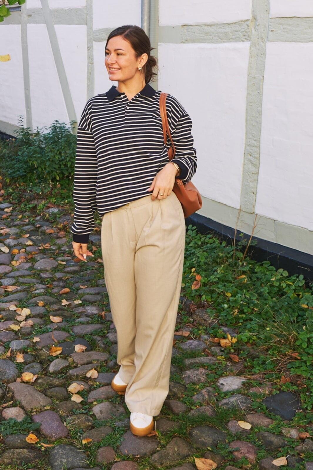 Sandfarbene Hosen von Neo Noir mit weitem Bein und Falten an der Taille. Die Hosen haben eine lockere Passform und eine hohe Taille, die gute Bewegungsfreiheit bietet.
