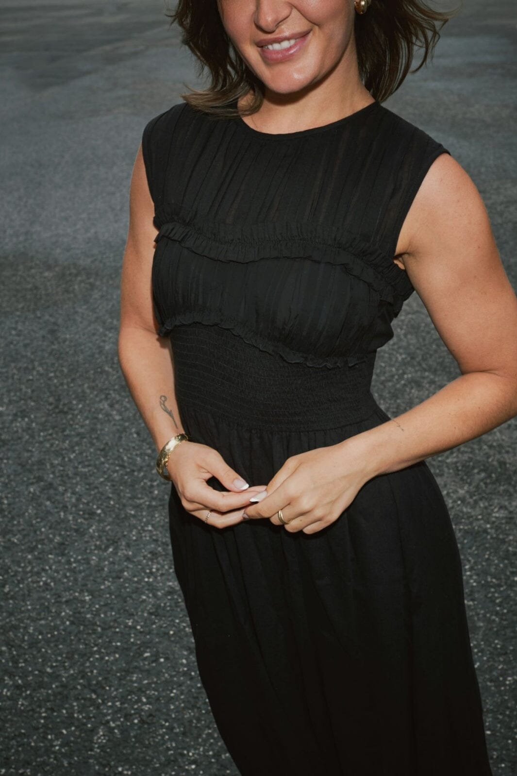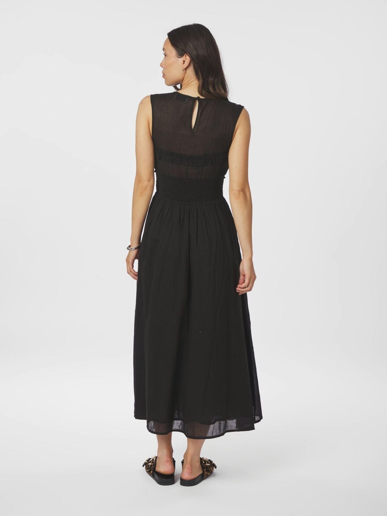 Schwarzes Voilekleid von Neo Noir mit geraffter Taille und ärmellosem Design. Das Kleid hat eine lange, fließende Silhouette mit Schlüsselaugenverschluss im Nacken und einem lockeren Rock.