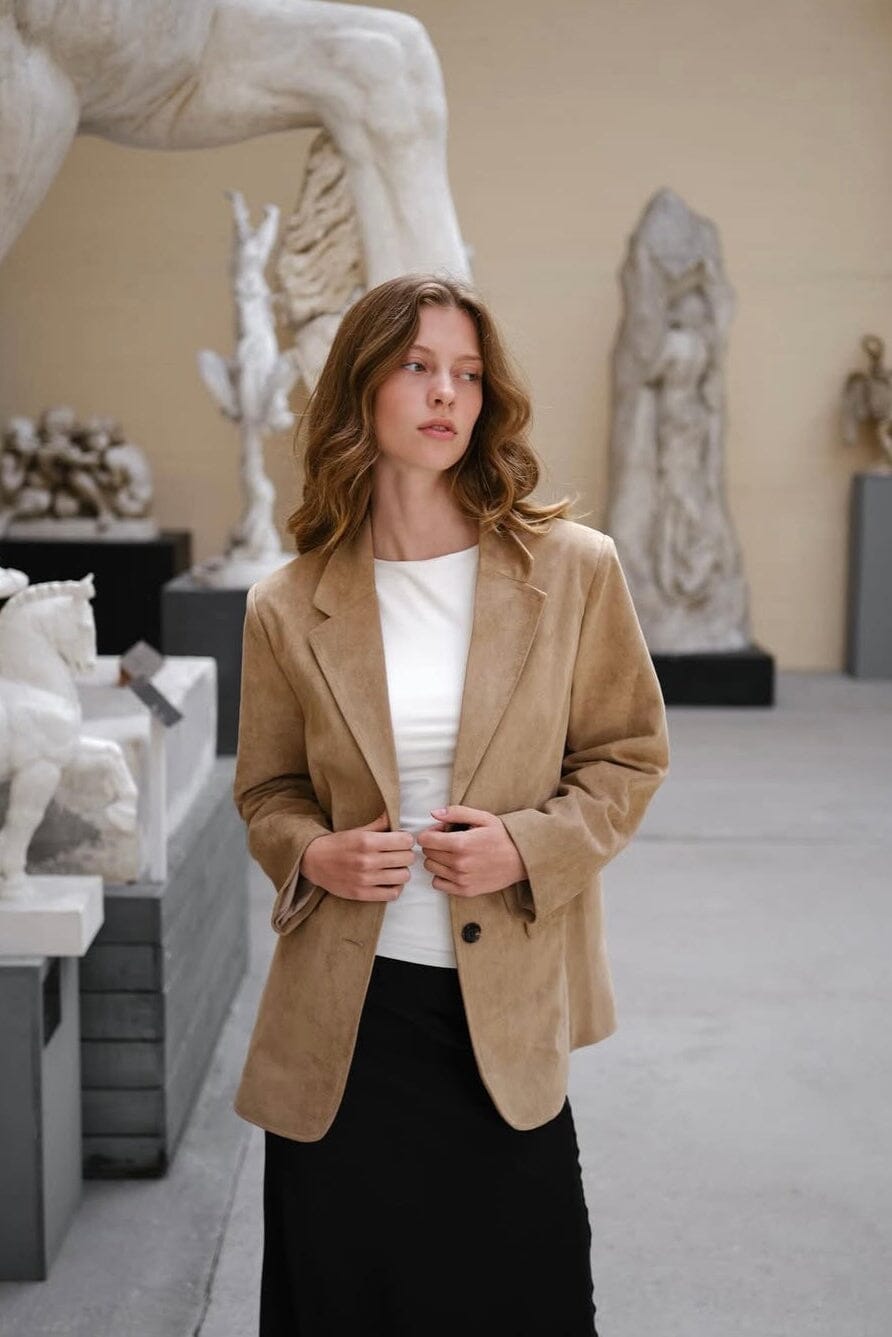 Sandfarbener Blazer von Neo Noir aus imitiertem Wildleder. Er hat einen spitzen Kragen und zwei Knöpfe vorne. Der Blazer kommt mit Vordertaschen und einer Regular Fit-Passform.