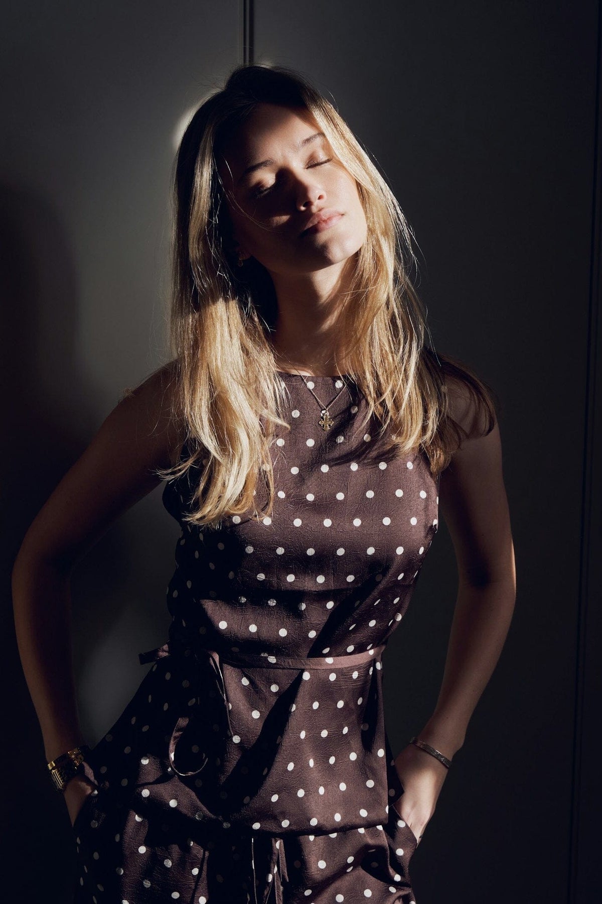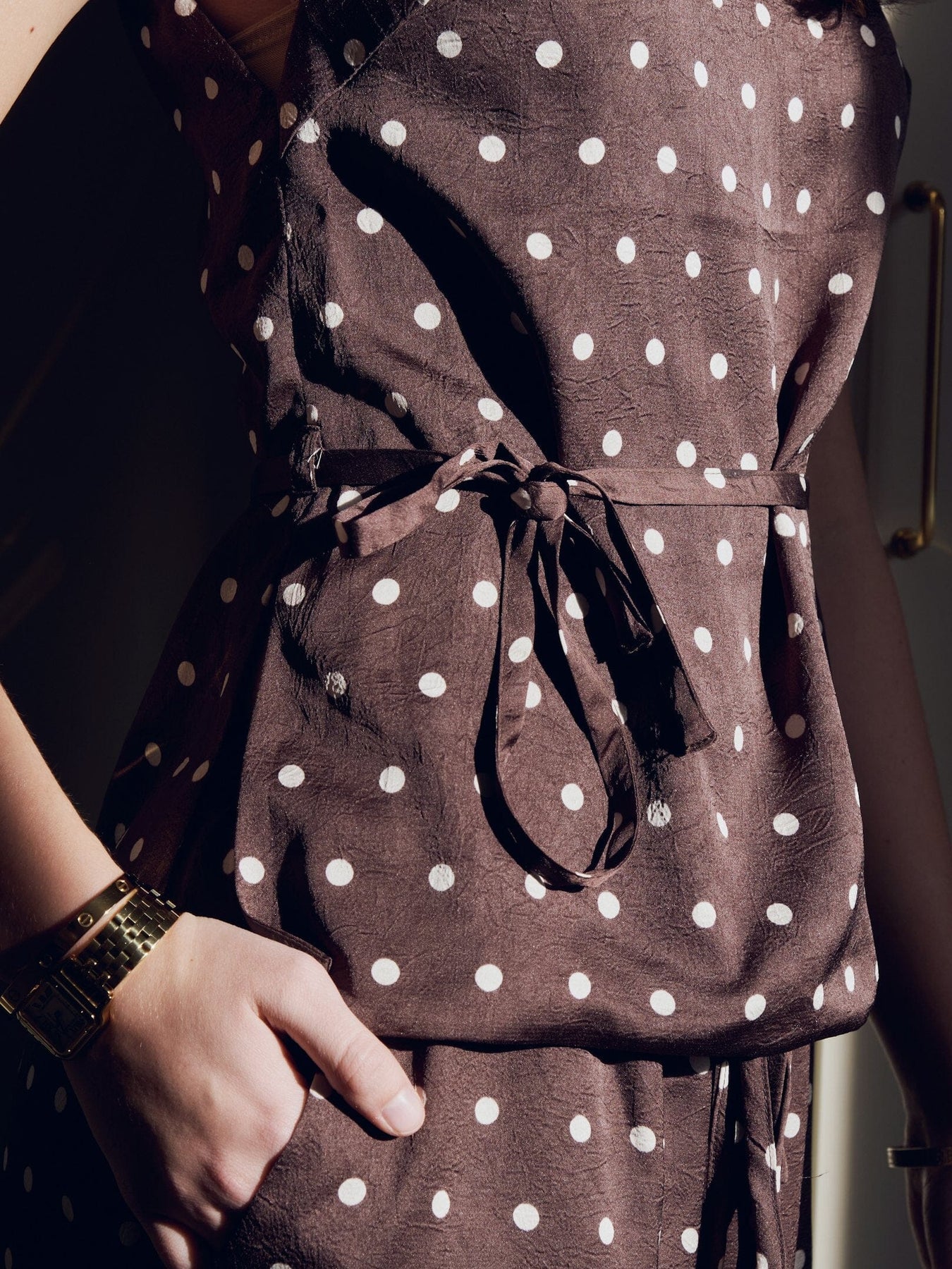 Dunkelbraunes Top von Neo Noir mit weißen Punkten. Das Top besteht aus 100 % Polyester und hat eine figurbetonte Passform.