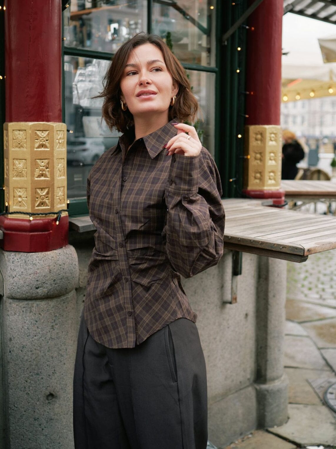Dunkelbraunes kariertes Hemd von Neo Noir mit asymmetrischer Knopfleiste. Das Hemd hat einen klassischen Hemdkragen und Rüschendetails, die ihm einen einzigartigen Ausdruck verleihen.