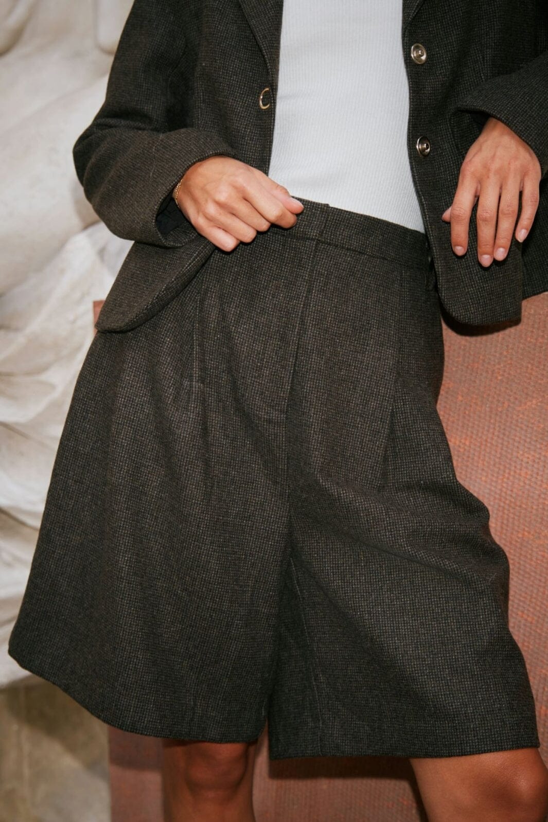 Braune karierte Shorts von Neo Noir mit hoher Taille und breiten Falten. Die Shorts haben eine lockere Passform und Knielänge, was sie einfach macht, für verschiedene Anlässe zu stylen.