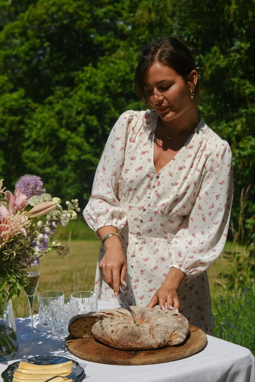 Blumenkleid von Neo Noir mit rosa Blumen auf hellem Grund. Das Kleid hat einen V-Ausschnitt, 3/4 Puffärmel und Knöpfe vorne.