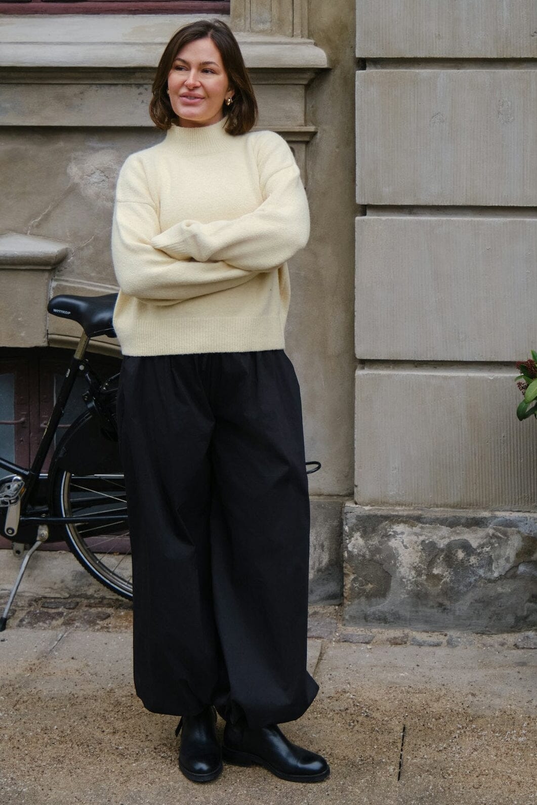 Buttergelbe Strickbluse von Neo Noir mit hohem Kragen und langen Ärmeln. Die Bluse hat eine lockere Passform und besteht aus einer Mischung aus Polyester, Acryl, Wolle und Elasthan.