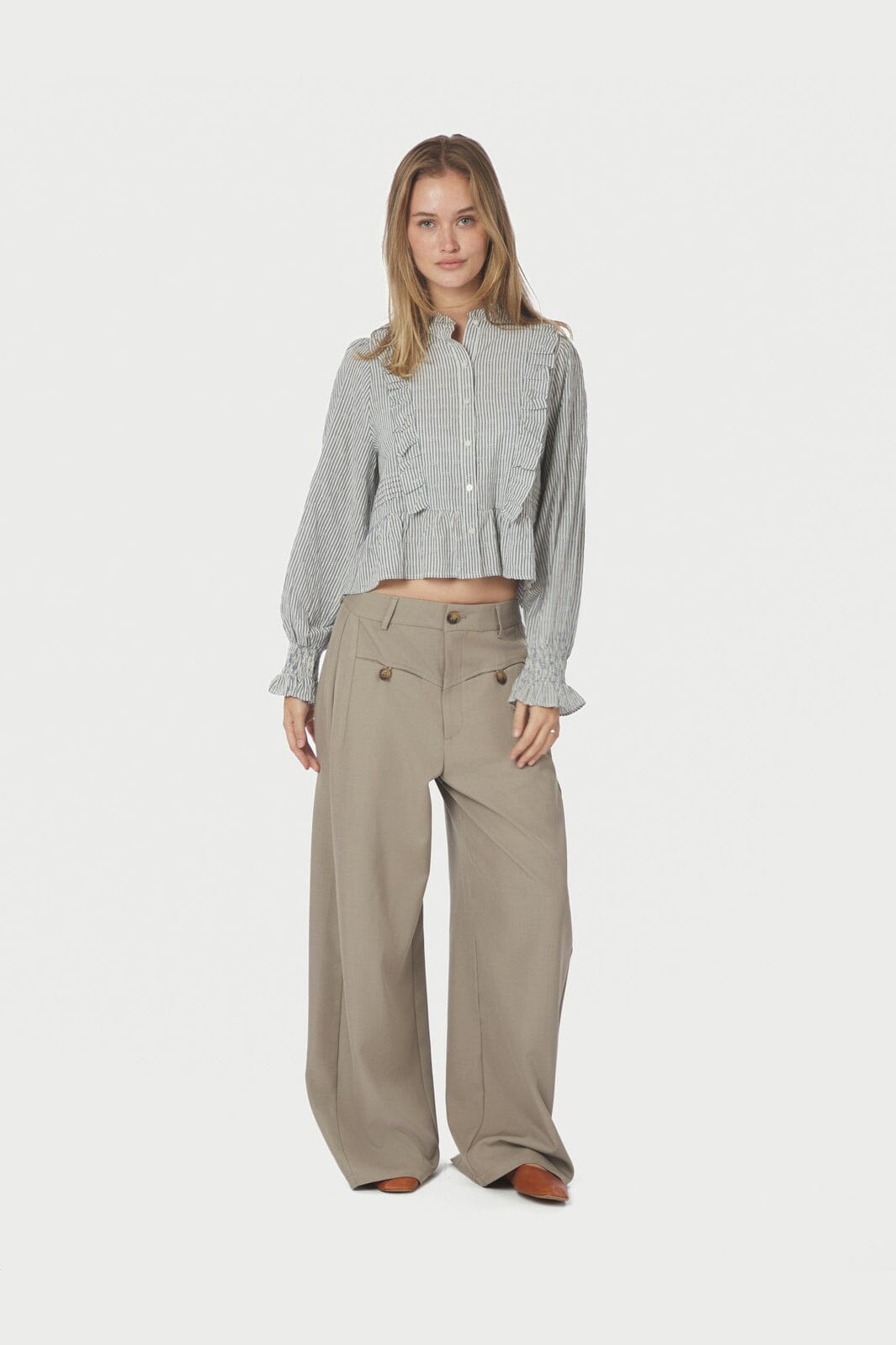 Gestreifte Bluse von Neo Noir aus 100 % Baumwolle. Die Bluse hat vertikale Streifen in Blau, Creme und Weiß mit gerafften Abschlüssen.