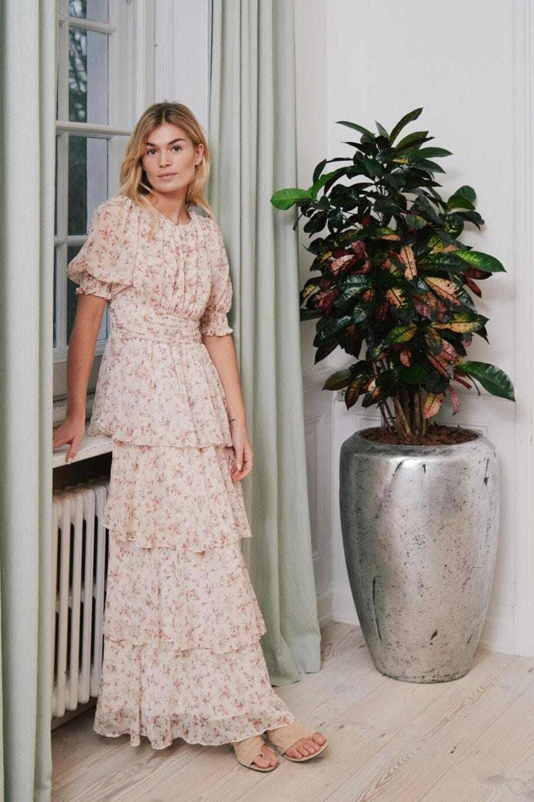 Kleid von Neo Noir in Creme mit Blumenprint. Das Kleid besteht aus Polyester und hat eine knöchellange Länge mit mehreren Lagen im Rockteil.