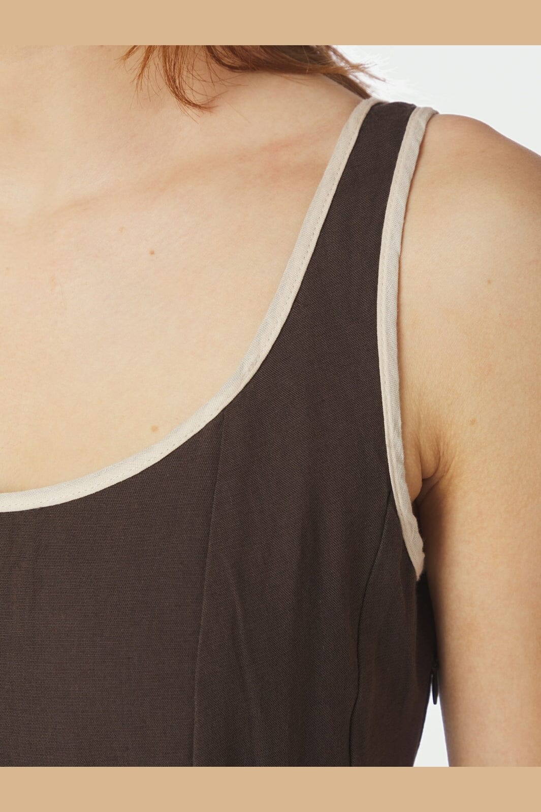 Dunkelbraunes Kleid von Neo Noir, gefertigt aus einer Mischung aus Baumwolle und Leinen. Das Kleid hat Träger und einen eckigen Ausschnitt.