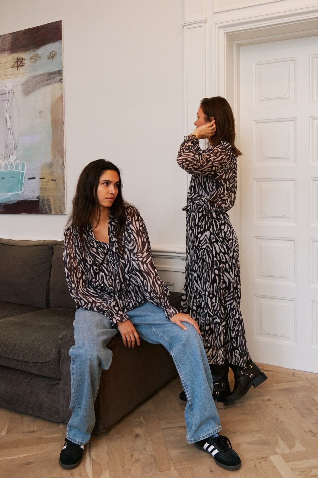 Schwarz-weiße Kleid von Neo Noir mit abstraktem Leopardenmuster. Das Kleid hat einen V-Ausschnitt, lange Ärmel und reicht bis zur Mitte der Wade. Rüschen und Bindebänder verleihen dem Kleid eine besondere Note.