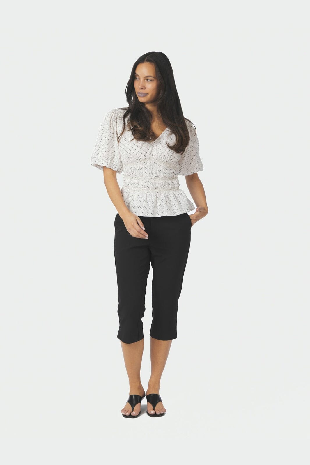 Weiße Bluse von Neo Noir mit kleinen schwarzen Punkten. Die Bluse hat kurze Ärmel und einen V-Ausschnitt mit Smok in der Taille.