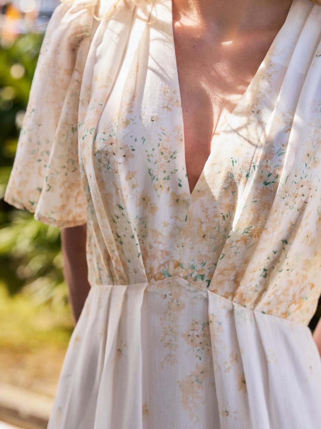 Hellgelbes Kleid von Neo Noir mit Blumenprint. Das Kleid hat einen V-Ausschnitt und kurze Ärmel. Es reicht bis zur Wade und eignet sich sowohl für den Alltag als auch für festliche Anlässe.