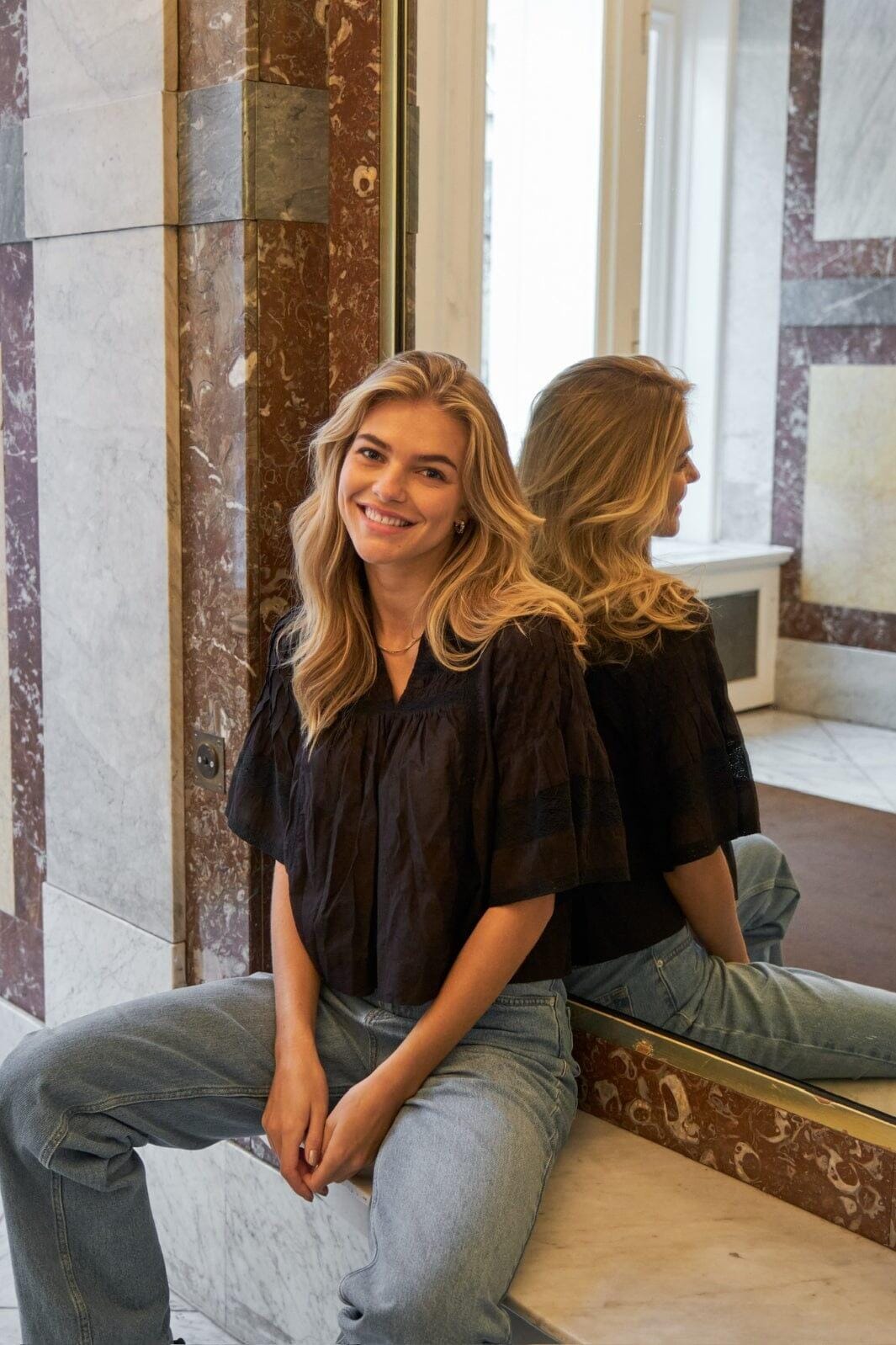 Schwarze Voile-Bluse von Neo Noir mit lockerer Passform. Die Bluse hat Bänder und kleine Falten am Ausschnitt sowie breite 3/4-Ärmel, die direkt über dem Ellbogen enden.