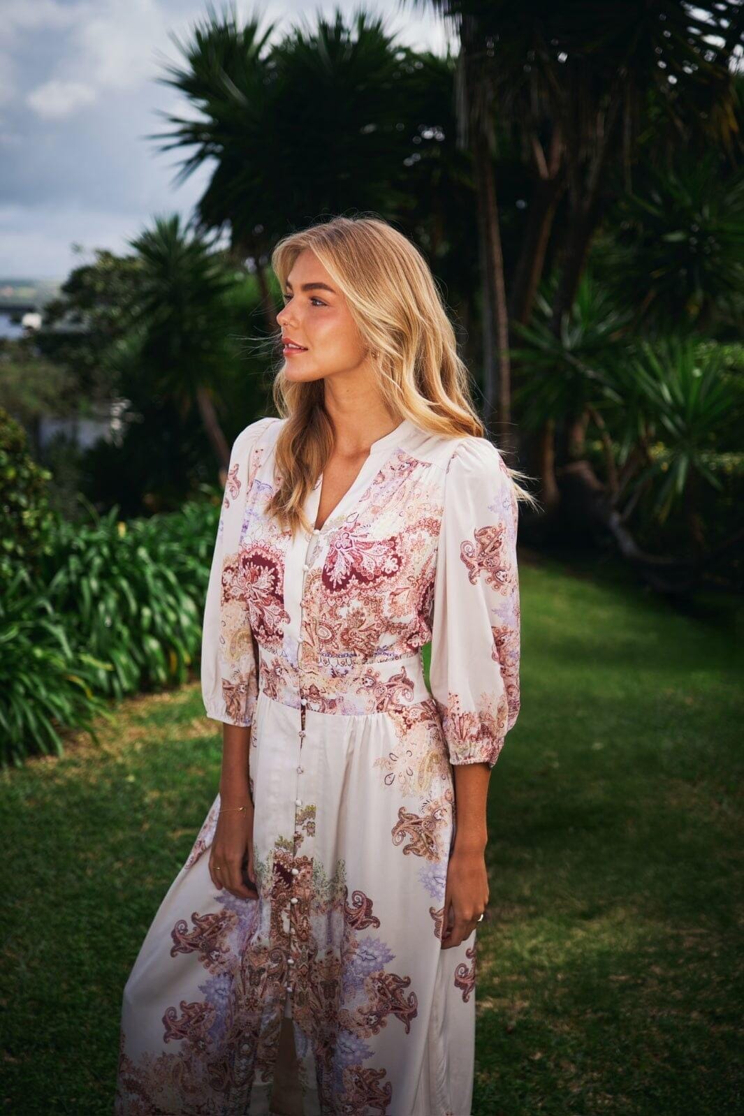 Langes Kleid in cremeweiß mit Paisleymuster von Neo Noir. V-Ausschnitt mit Knopfverschluss vorne und Smockdetail in der Taille auf der Rückseite. 3/4 Puffärmel und Knöchellänge.