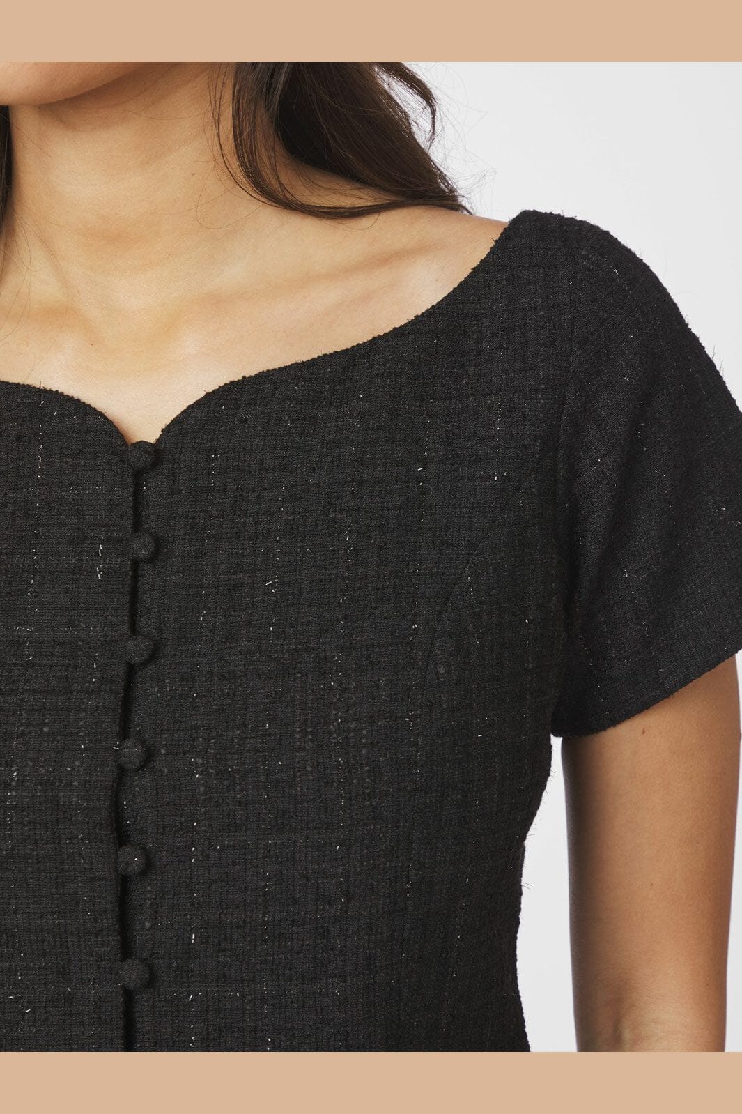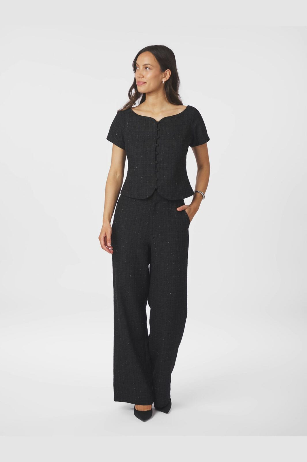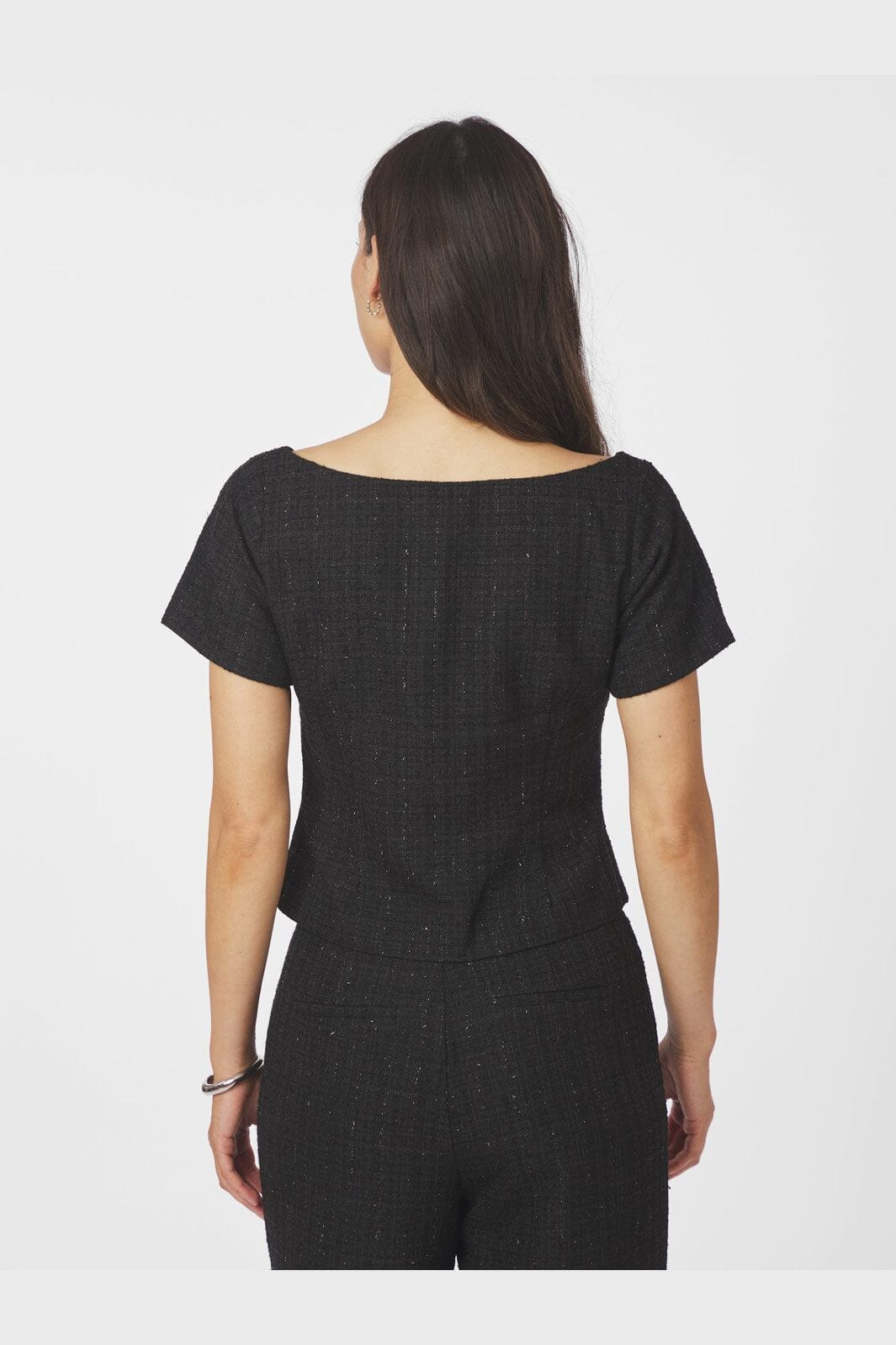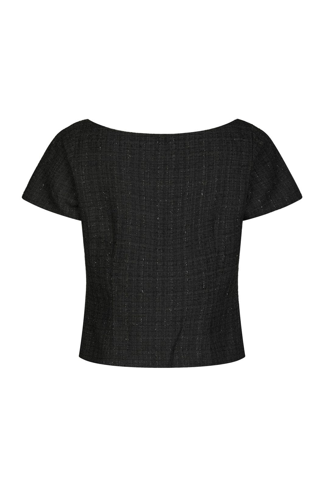 Schwarzes Bouclé-Top von Neo Noir mit strukturierter Oberfläche und leichtem Glitzereffekt. Das Top hat eine figurbetonte Passform mit Rundhalsausschnitt und kurzen Ärmeln.