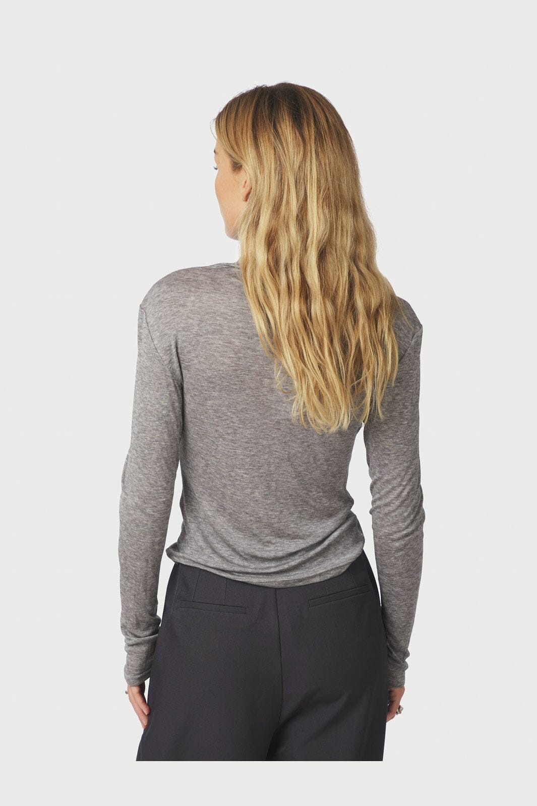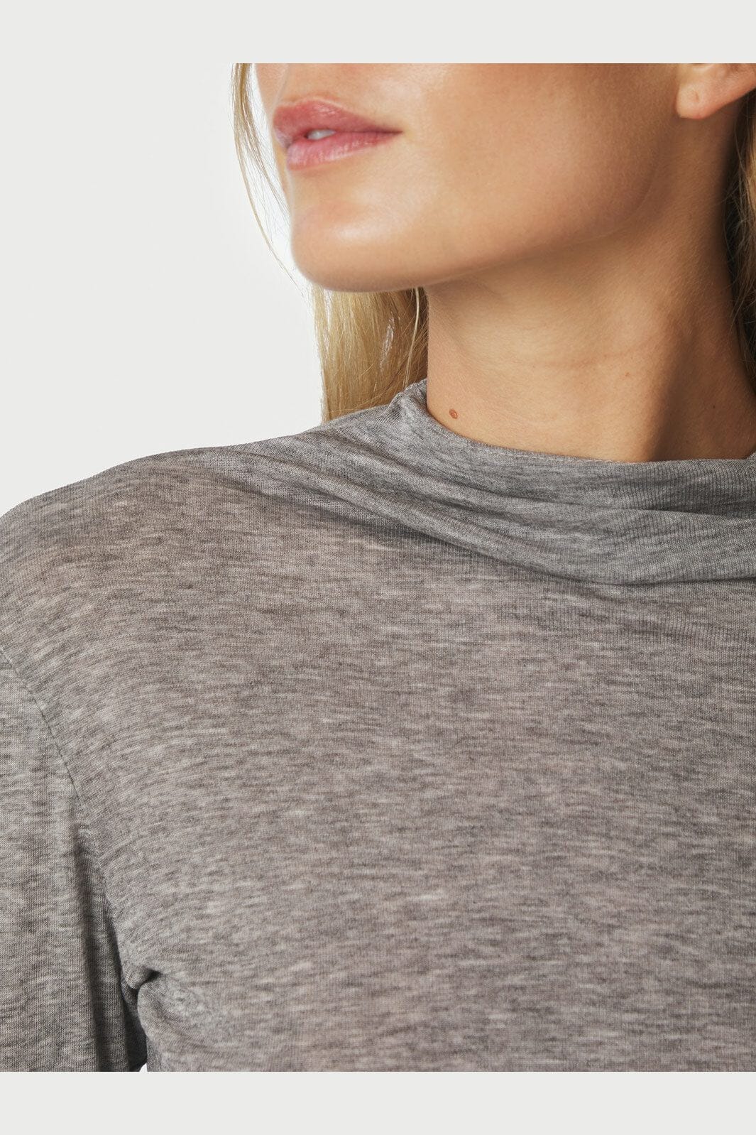 Graue Rippstrickbluse von Neo Noir mit hohem Kragen und figurbetonter Passform. Die Bluse hat eine melierte Oberfläche und besteht aus einer weichen Mischung aus Lyocell und Wolle.