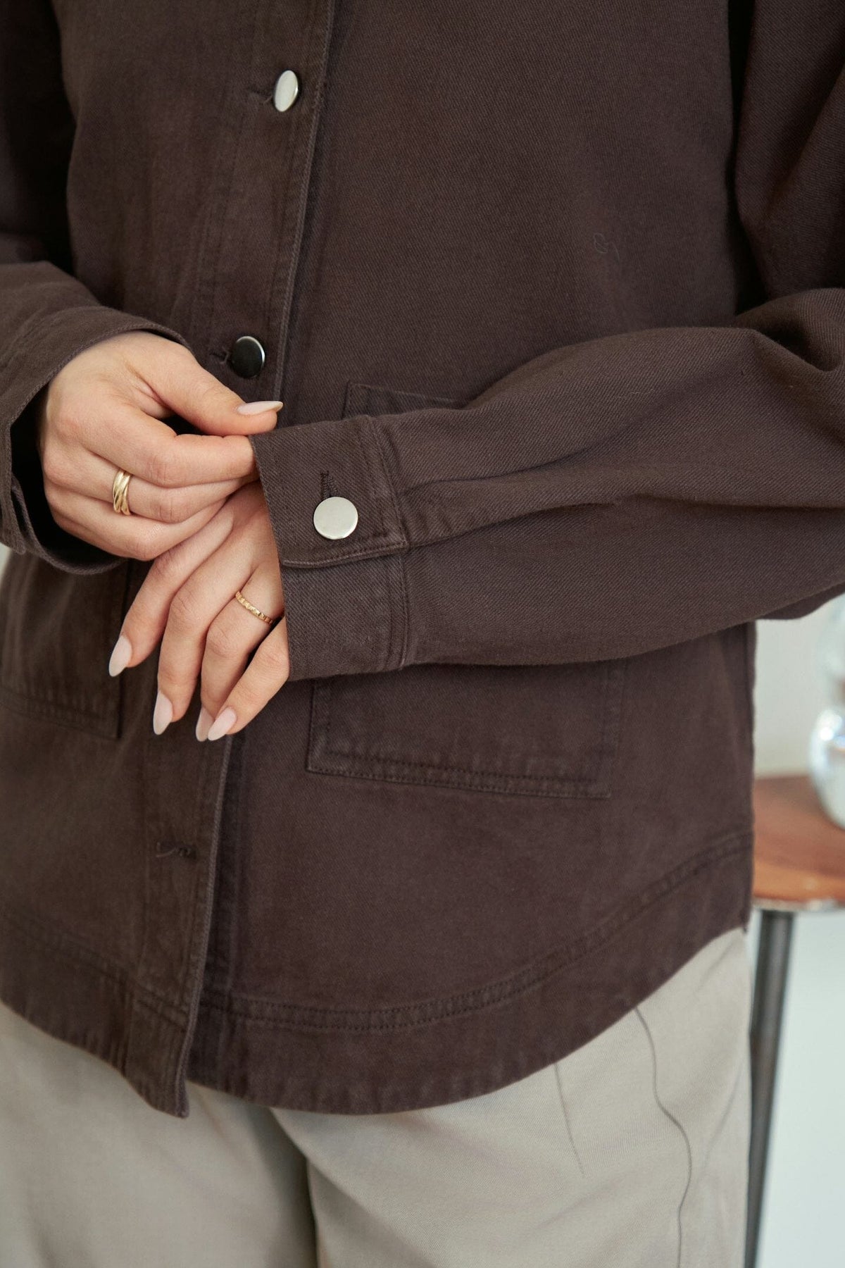 Dunkelbraune Jacke von Neo Noir aus Canvasmaterial. Die Jacke hat eine lockere Passform mit Knöpfen vorne und zwei Brusttaschen mit Klappe. Die dekorativen Nähte verleihen der Jacke einen rustikalen Touch.
