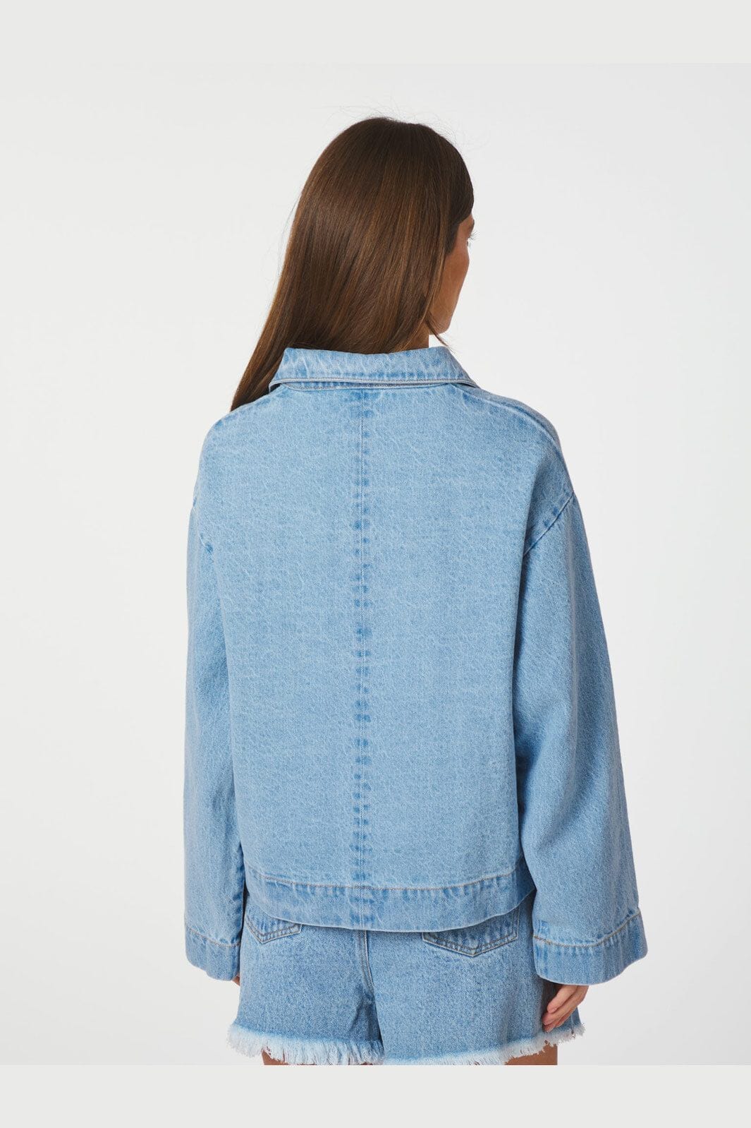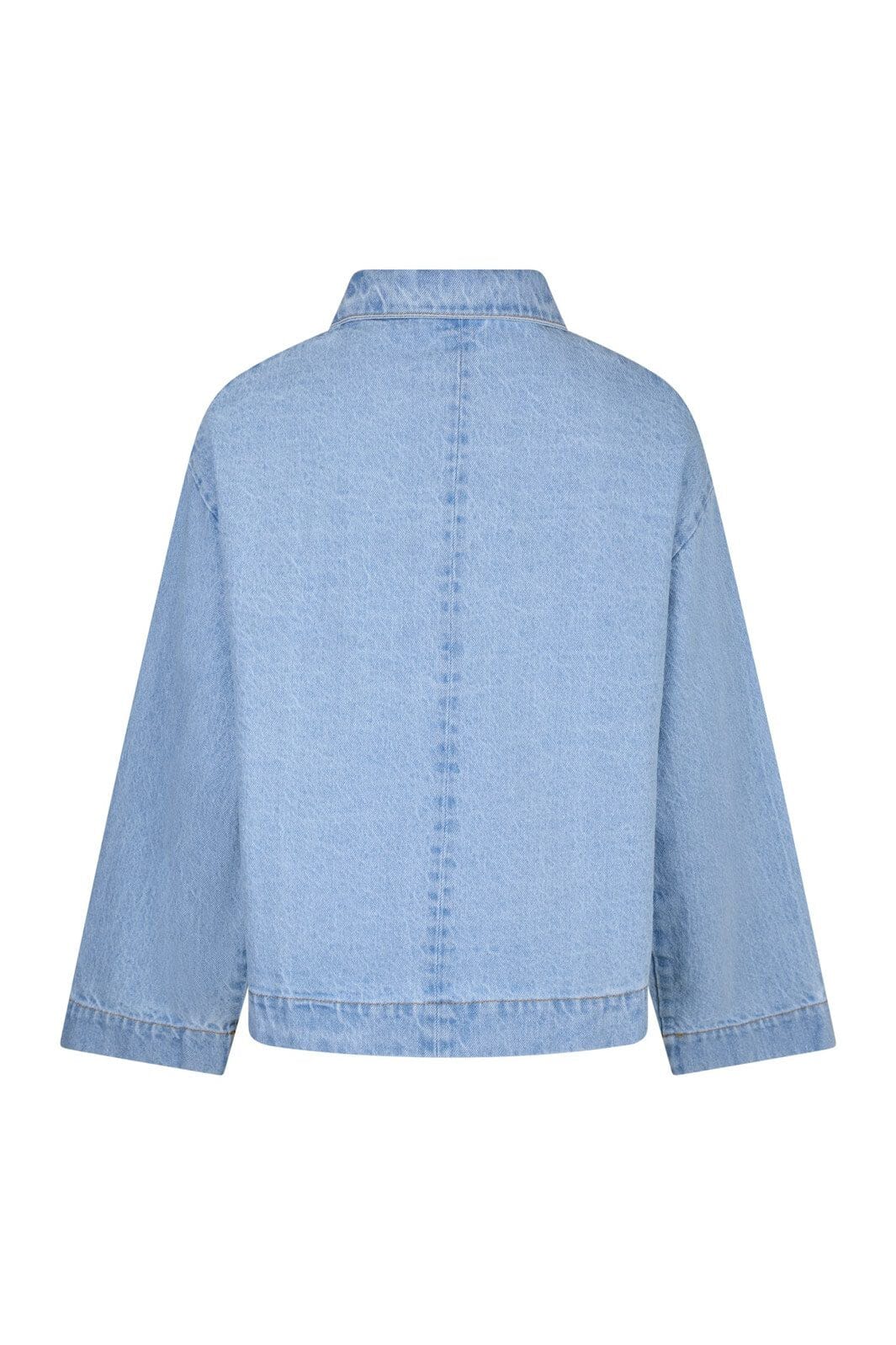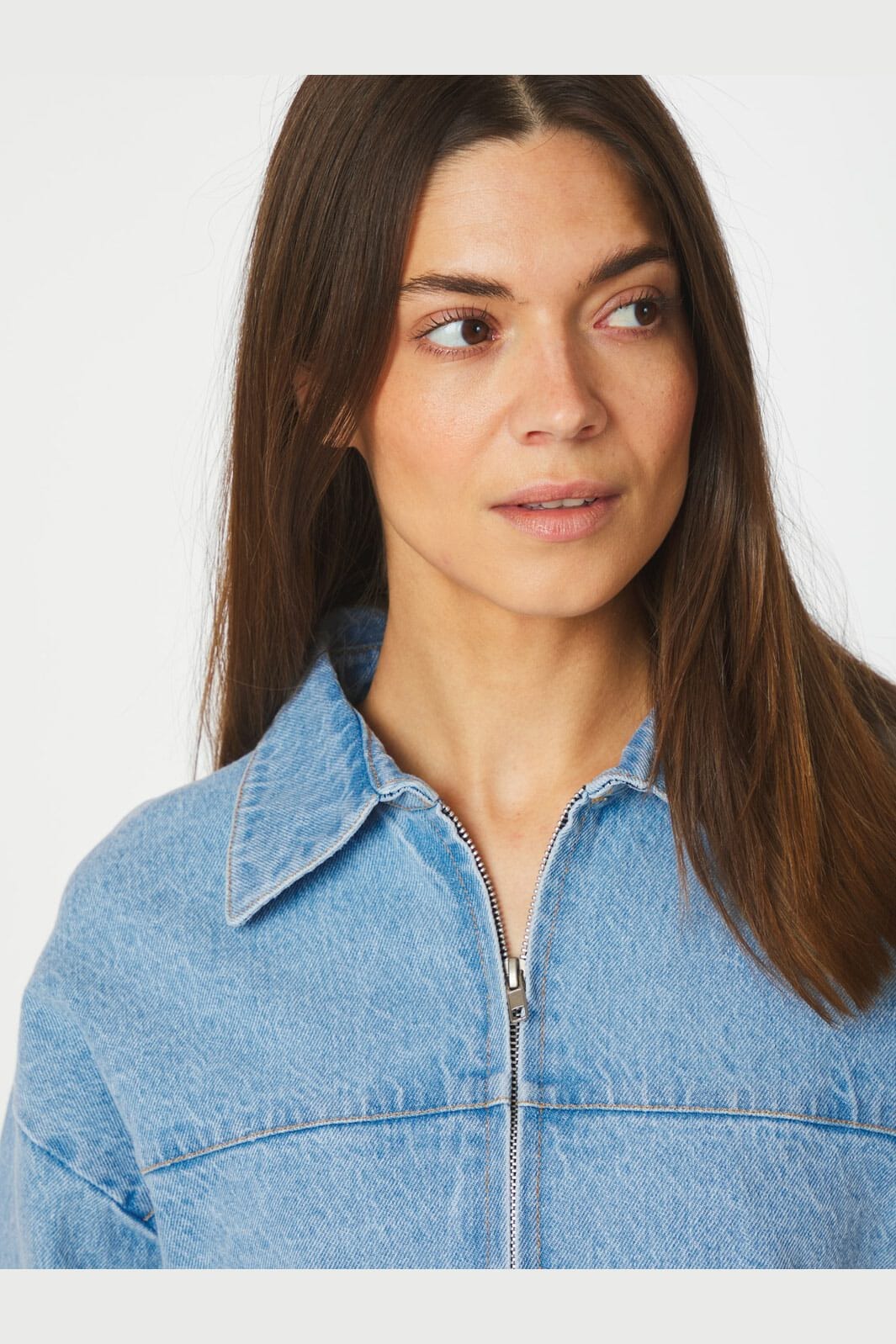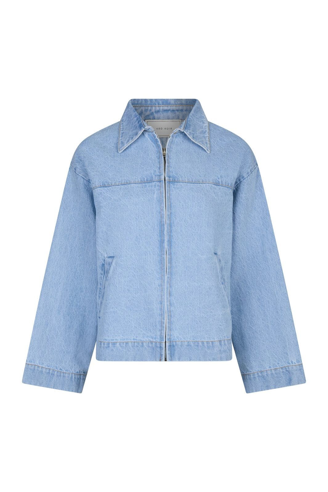 Denimjacke von Neo Noir in hellblau. Ein Oversize-Modell mit Umlegekragen und Reißverschluss vorne. Die Jacke hat praktische Seitentaschen und ist aus Denim-Qualität gefertigt.