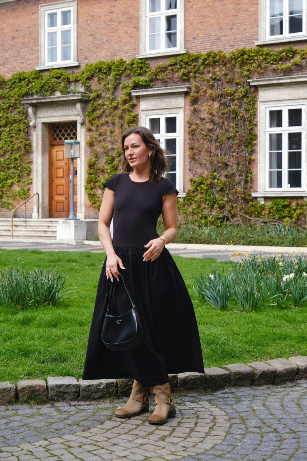 Schwarzes Kleid von Neo Noir mit zwei verschiedenen Materialien. Der Oberteil ist aus Jersey mit kurzen Ärmeln und Rundhalsausschnitt, während der Rock aus Popeline mit Rüschendetails und einem vollen Rock besteht.